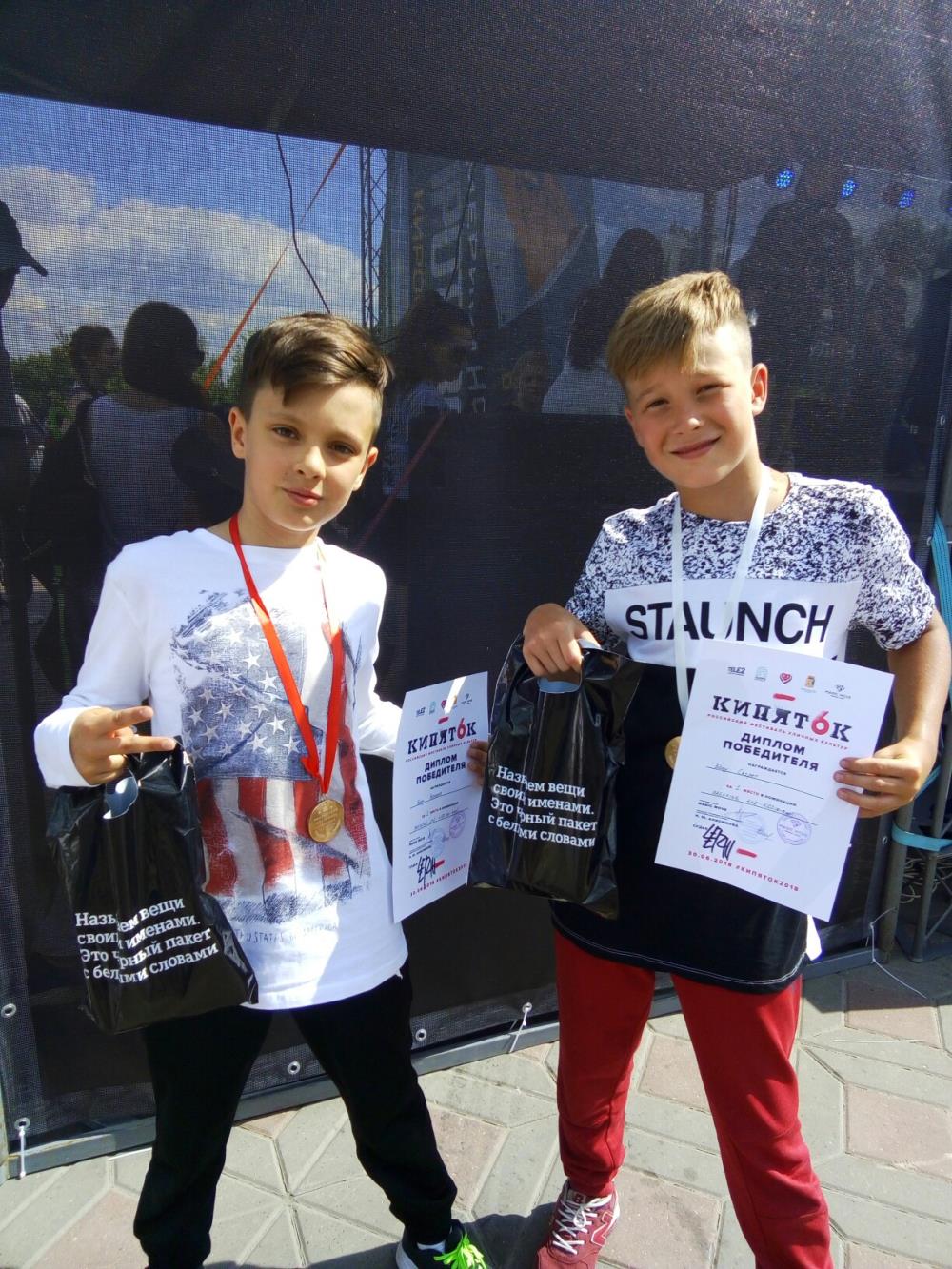Жаркое противостояние, сильные соперники, строгое судейство и заслуженная победа! Помимо статуса лучших брейкдансистов мальчики получили медали и приятные призы. Артем получил в награду мобильный телефон и пригласительный билет в кинотеатр «Смена», а Ярославу и Филиппу вручили подарочные сертификаты в магазин модной детской одежды и значки фестиваля.