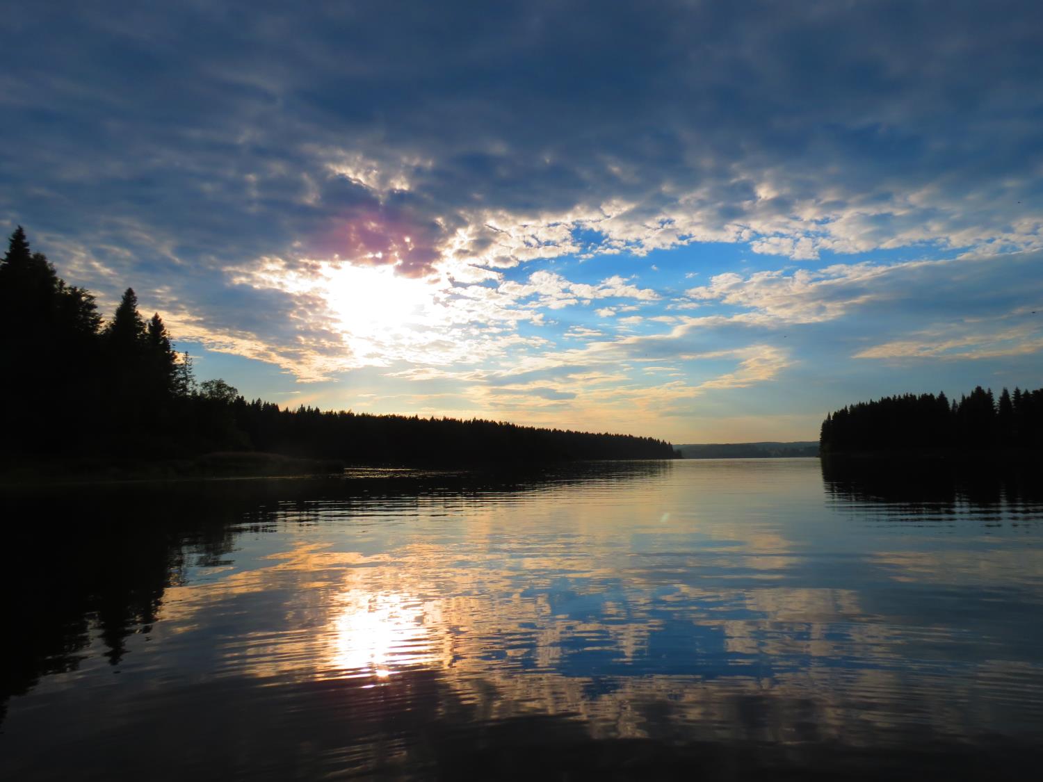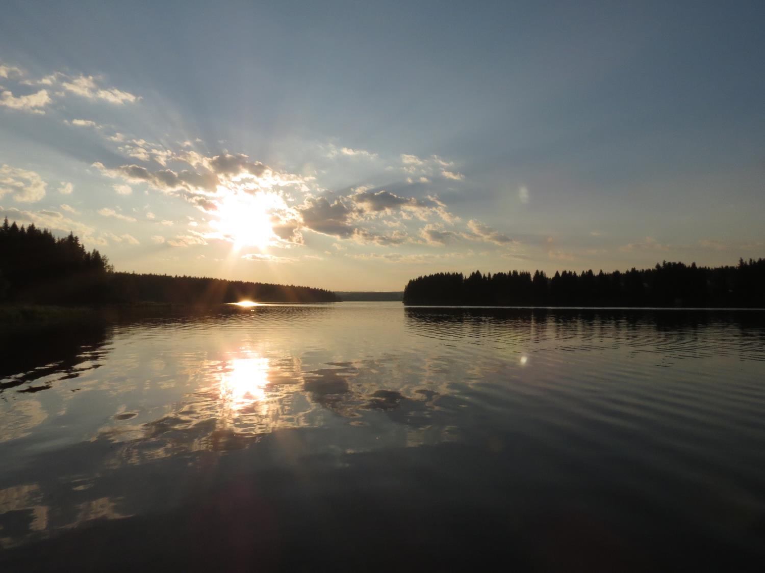 | Июнь. Вечер на Омутнинском пруду. Песчанка. Закат. Данный снимок сделан 27 июня 2013 года со стороны дамбы на реке Песчанке. Кадр конечно получился тёмным, но уж больно красивым мне показался закат. Тишина, спокойствие, заходящее солнце, рыбалка. Что ещё может быть лучше?