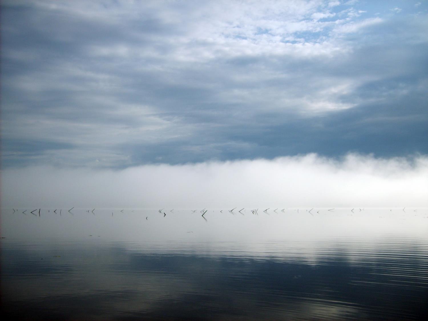| Чёрнохолуницкий пруд, туман. Снимок был сделан 2 августа 2009 года. Приехав на рыбалку на пруд пос. Чёрная Холуница увидел такую картину - стоял плотный сильный туман, который закрывал весь водоём, другого берега было не видно. Тишина, гладь воды, в которой отражается небо, ползущие клубы тумана и чёрные коряги торчащие из воды - всё это создавало ощущение ирреальности.