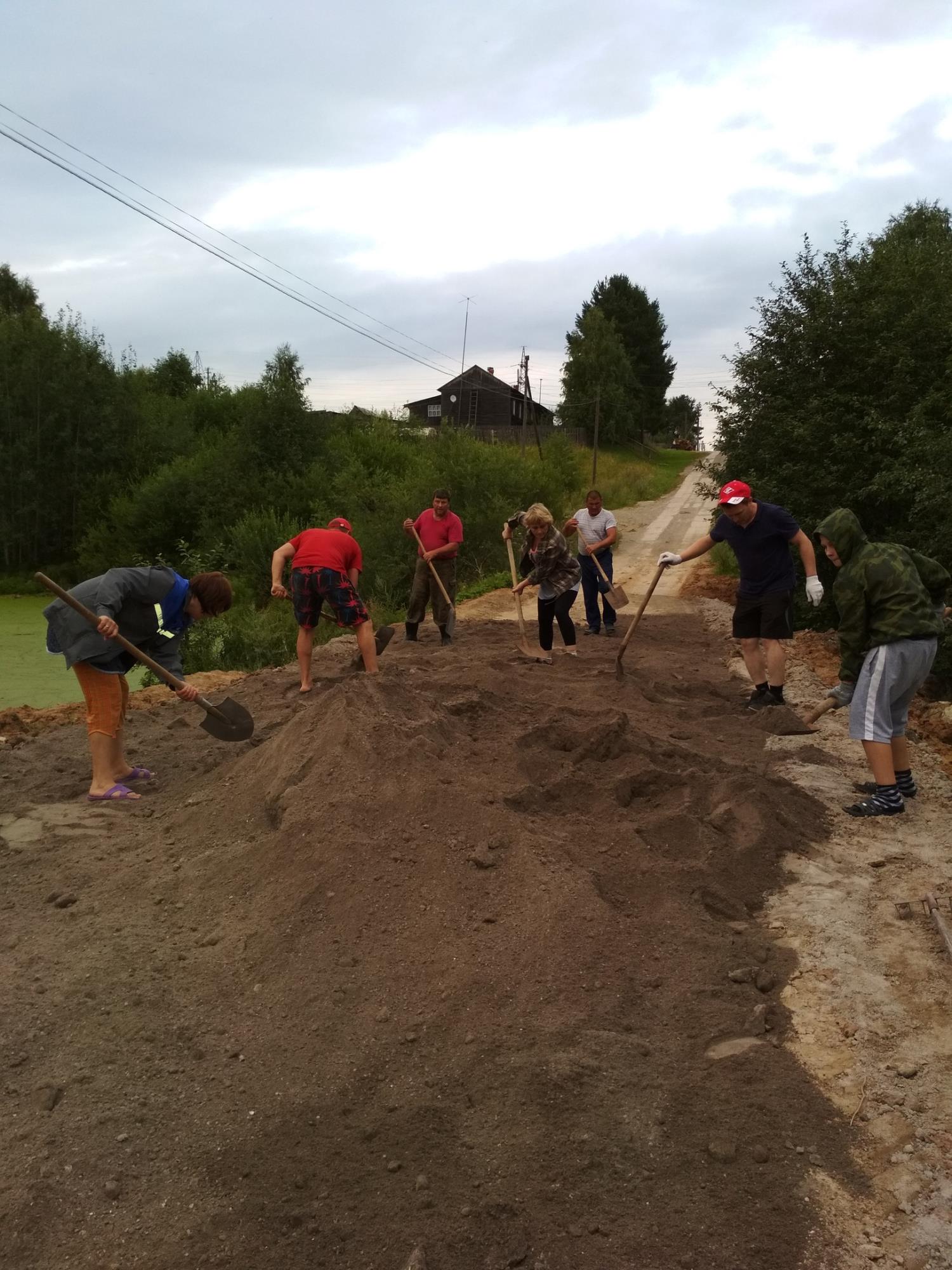 В итоге не прошло и часа, как материал небольшими кучами лежал на дороге. На его разравнивание вышли местные жители Ольга Кайсина, Андрей Кропачев, Сергей Чащин, Оксана и ее сын Вадим Собенины, Константин Власов и Александр Трефилов.