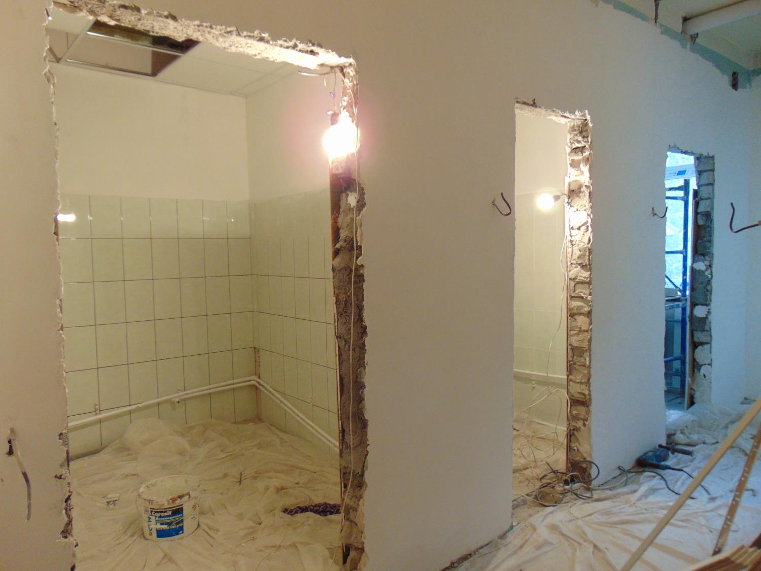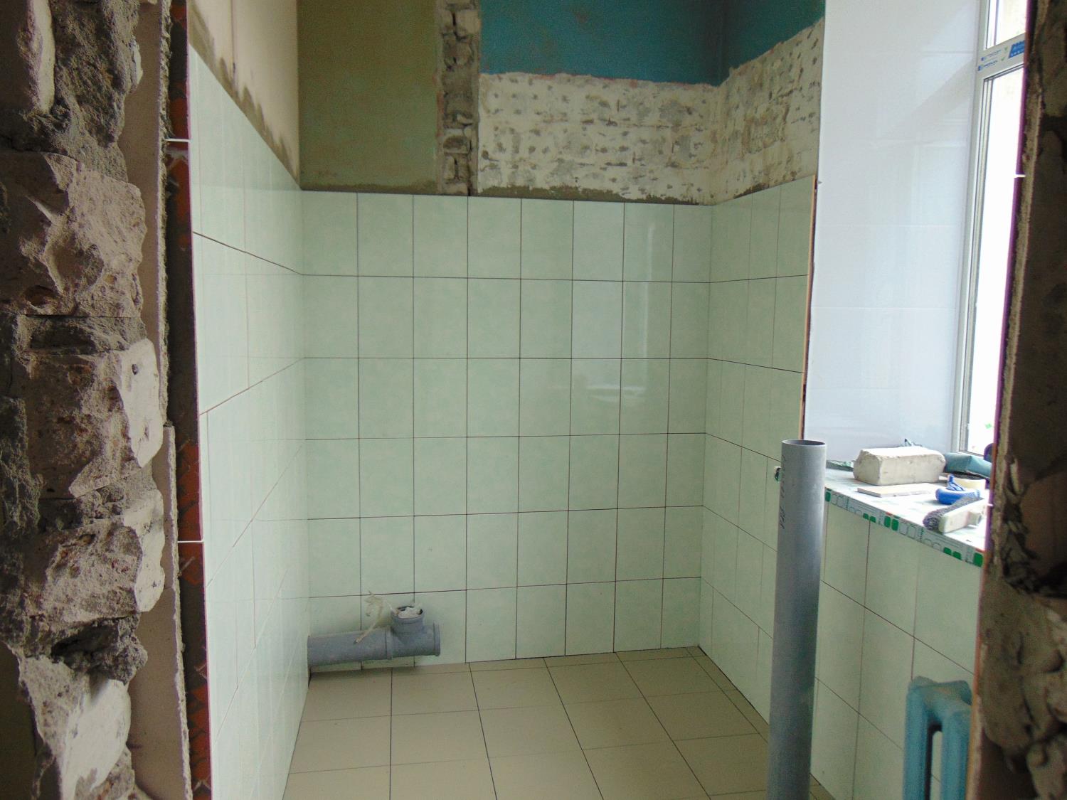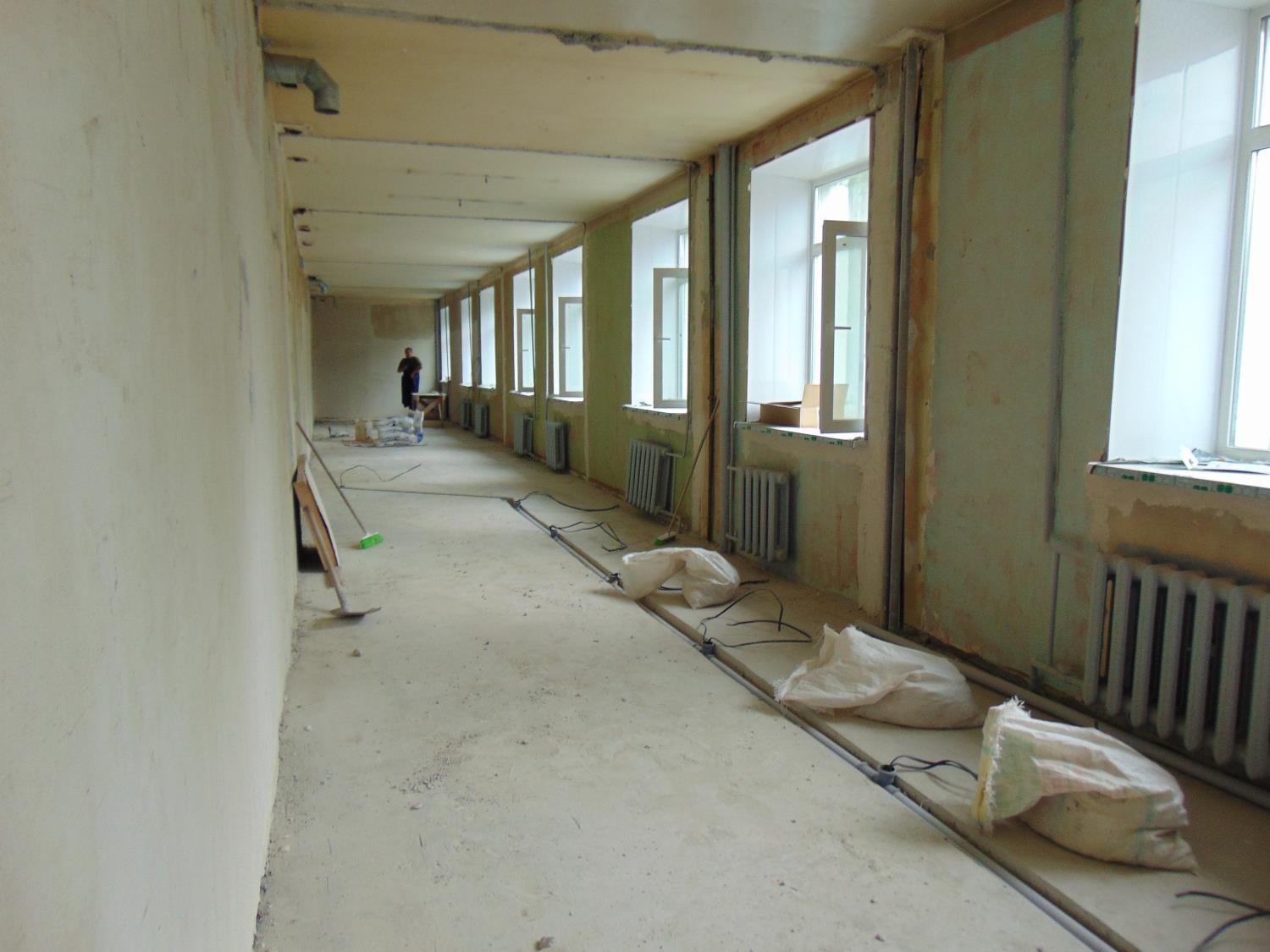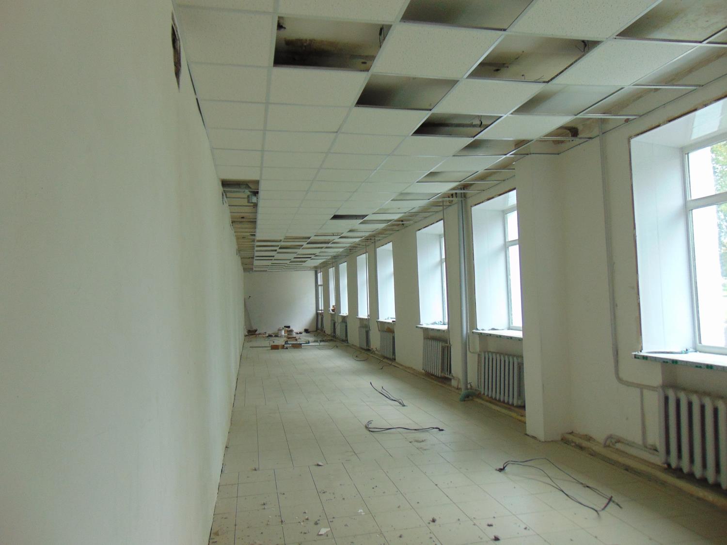 Персонал подрядной организации трудится на объекте с раннего утра и до позднего вечера. По данным на начало недели в кабинетах уже была положена плитка и частично сделаны потолки, в санузлах начали монтаж потолков, установили систему вентиляции.