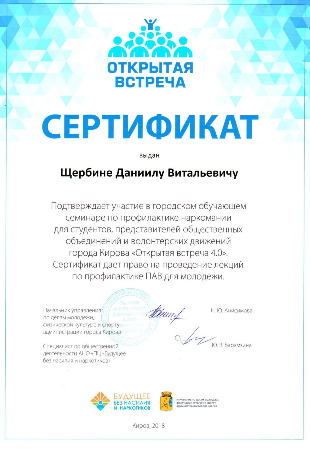 По итогам обучения Даниил Щербина получил Сертификат, предоставляющий ему право на проведение лекций для молодежи по профилактике употребления психоактивных веществ.