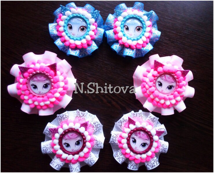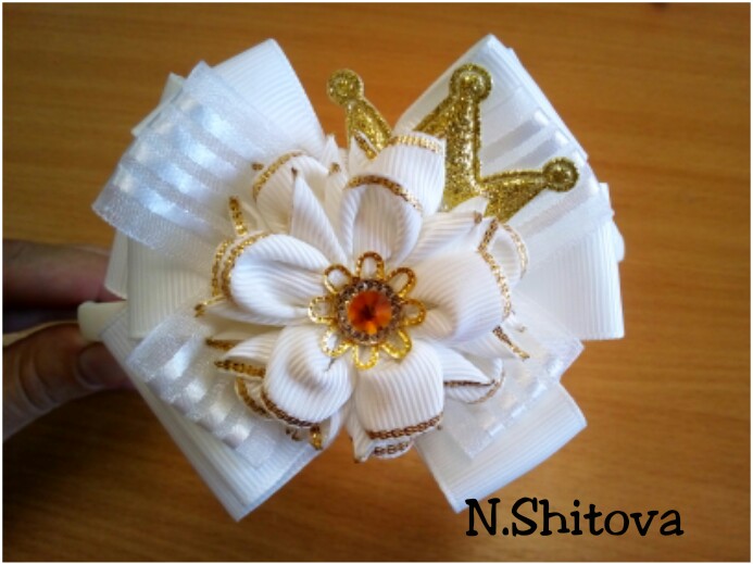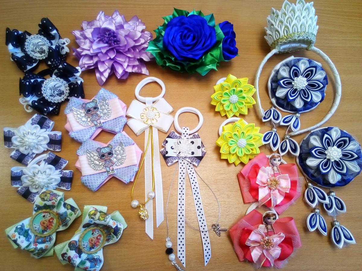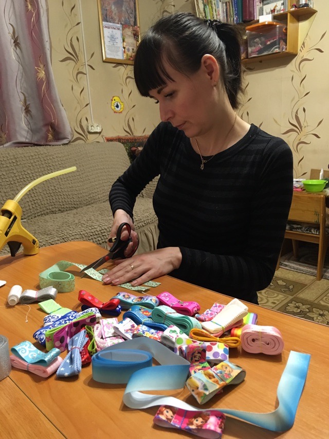 Сначала работы делала из атласных ленточек, для старшей дочери. Потом появилась и младшая дочь, которая просто обожает новые украшения. Сейчас в основном работаю с репсовыми ленточками и больше делаю не цветы (канзаши), а бантики.