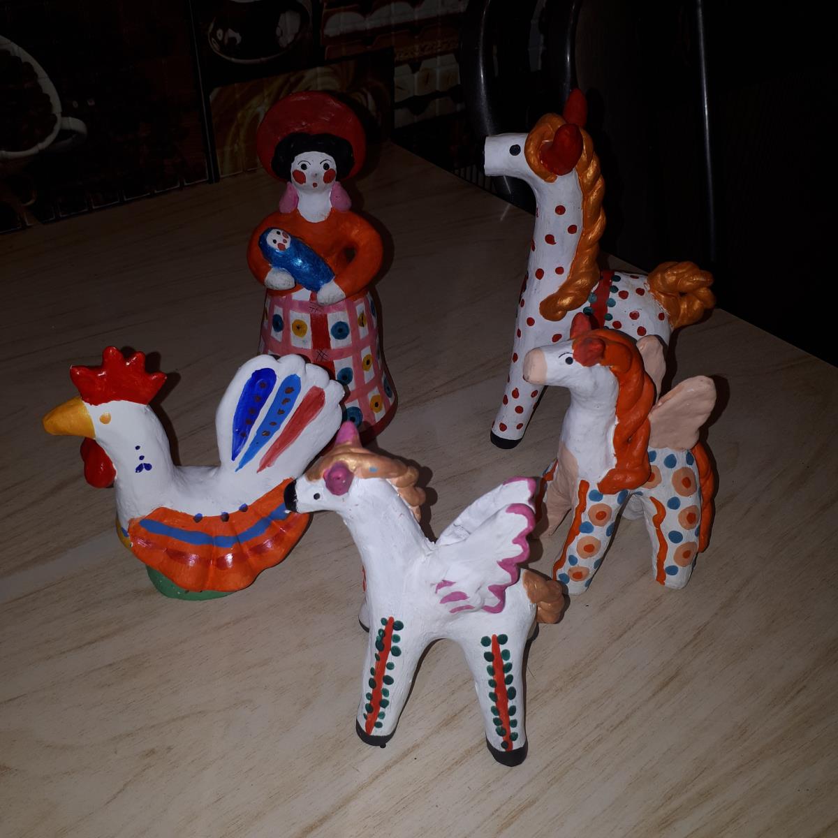 Получаю огромное удовольствие и радость от того, что сделала своими руками. Начинала лепить элементарные изделия: колобка, солнце и многое другое. Только потом перешла на изготовление дымковской игрушки: барышни, петуха, коня.