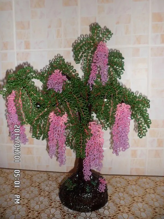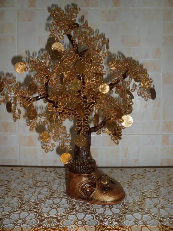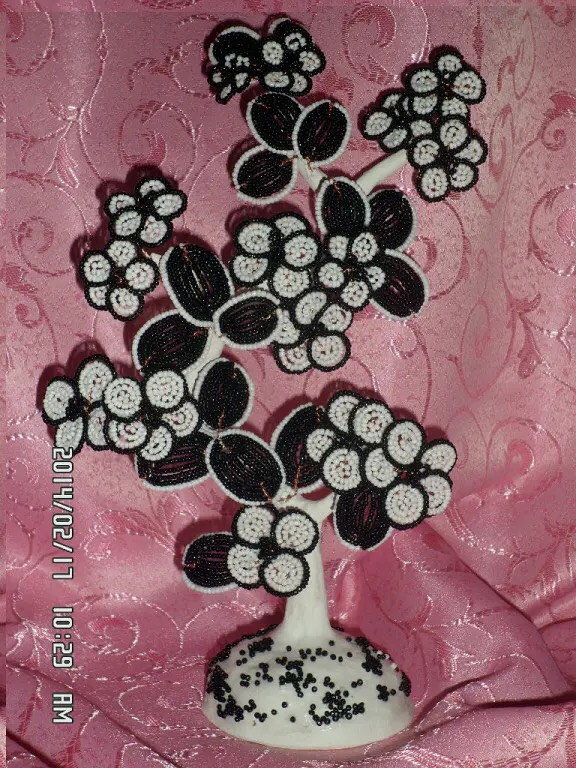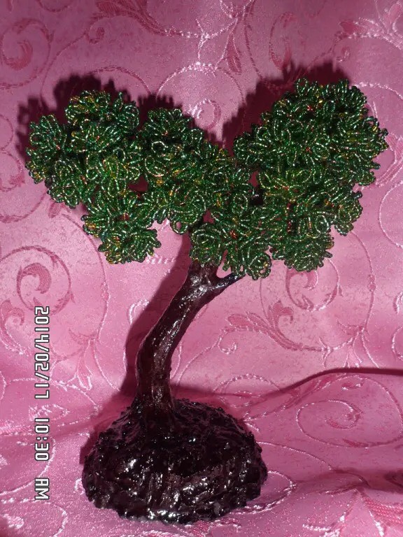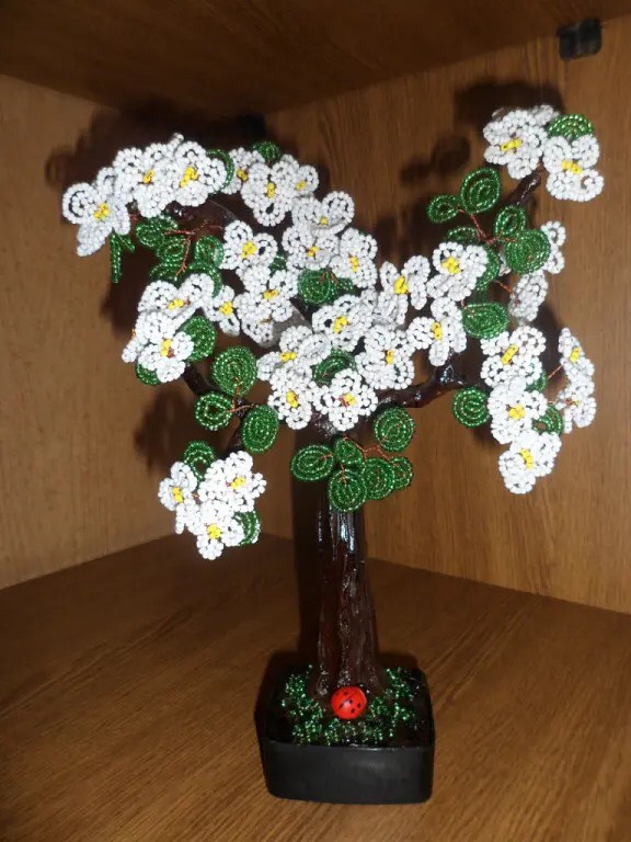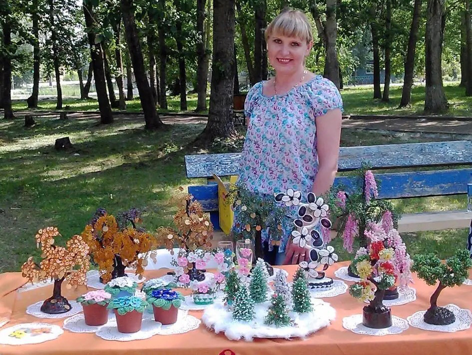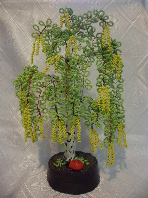 Заинтересовалась бисероплетением я десять лет назад, когда дочка, будучи четвероклассницей, подарила мне маленькое деревце. Для меня это было чудо-деревце. Шаг за шагом я стала осваивать технику плетения. Очень много работ подарила друзьям. Особым спросом пользуются денежные деревья и русские березы.