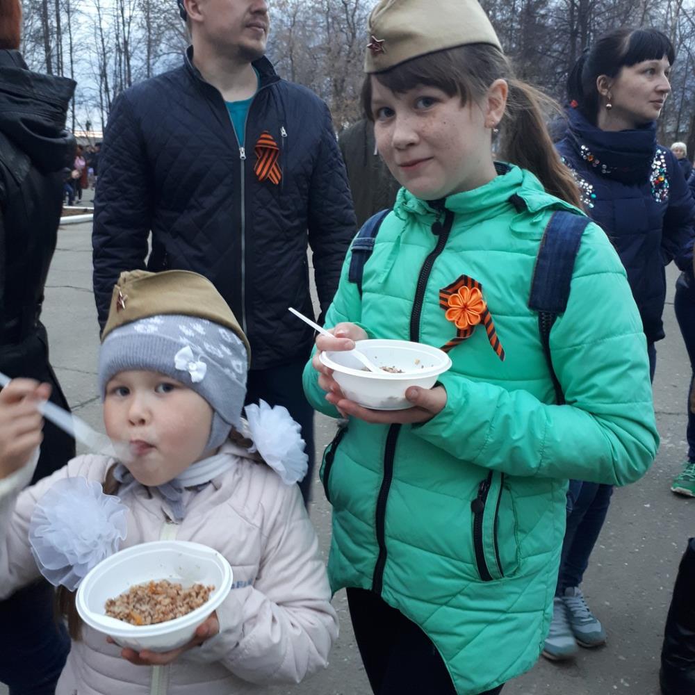 Мы смотрим концерт, участвуем в «Бессмертном полку» и кушаем «солдатскую кашу». Походная кухня приглашает всех желающих подкрепиться вкусной гречневой кашей и выпить свежего чая. Именно «солдатская каша» во время войны помогала солдатам набираться сил, храбрости, становиться смелыми и непобедимыми. Теперь каша стала моим любимым блюдом.