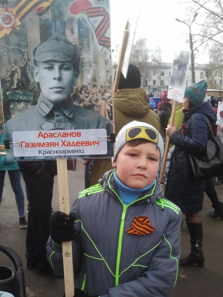 А ещё в 2018 году я шел в колонне «Бессмертного полка» и с гордостью нёс фотографию прадедушки Арасланова Газимзяна Хадеевича. К сожалению, он не вернулся с фронта, пропал без вести в самом начале войны в 1941 году. Но подвиг его не забыт, наша семья им гордится и чтит память о нём.