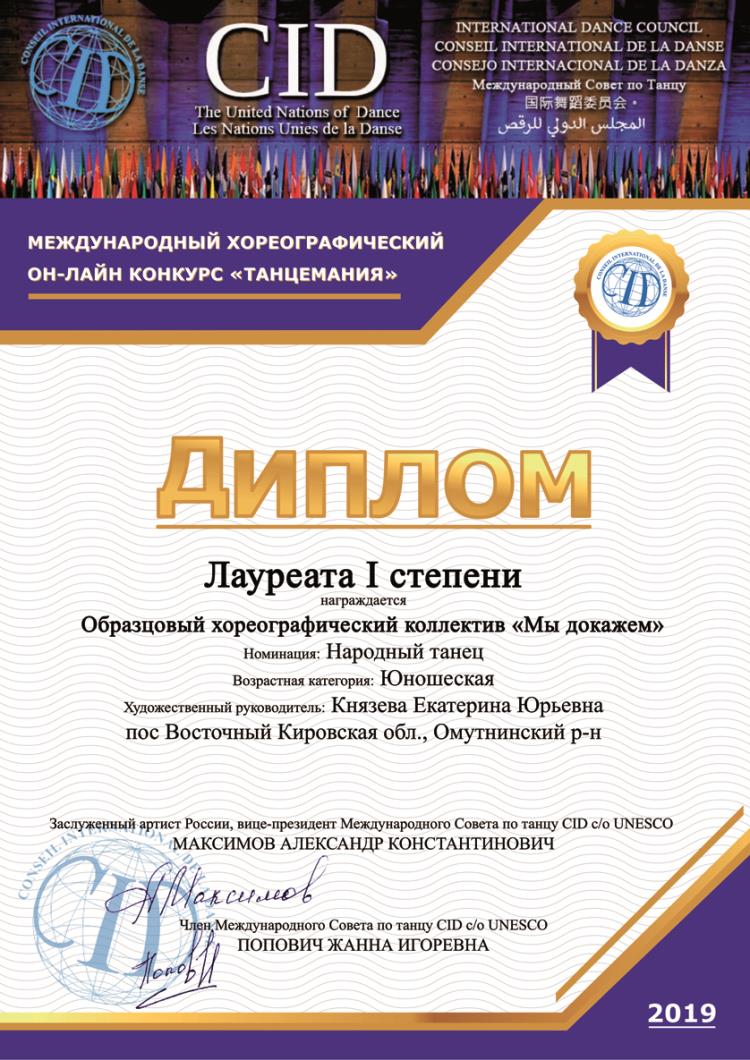 Воспитанники старшей группы образцового самодеятельного коллектива хореографического ансамбля «Мы докажем» (руководитель Екатерина Князева) приняли участие в заочном отборочном этапе международного хореографического конкурса «Танцемания», завоевав звание лауреата I степени за танец «Кубанский краковяк с характером».