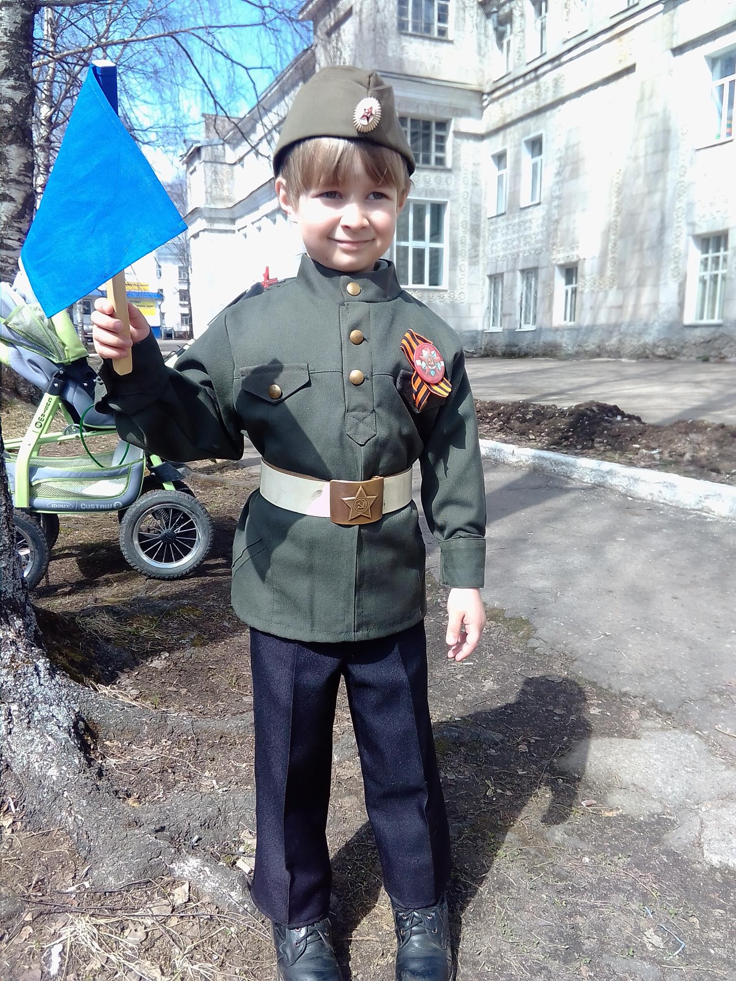 Моя мама работает в детском саду. Они с ребятами каждый год участвуют в фестивале патриотической песни, стихов, театрализованных представлений «Марафон Победы». В прошлом году и я принял в нем участие. Мы с мамой рассказывали стихотворение «Маленький защитник». Это было здорово! Там все говорили о войне. Я очень горжусь, что первый раз надел военную форму!