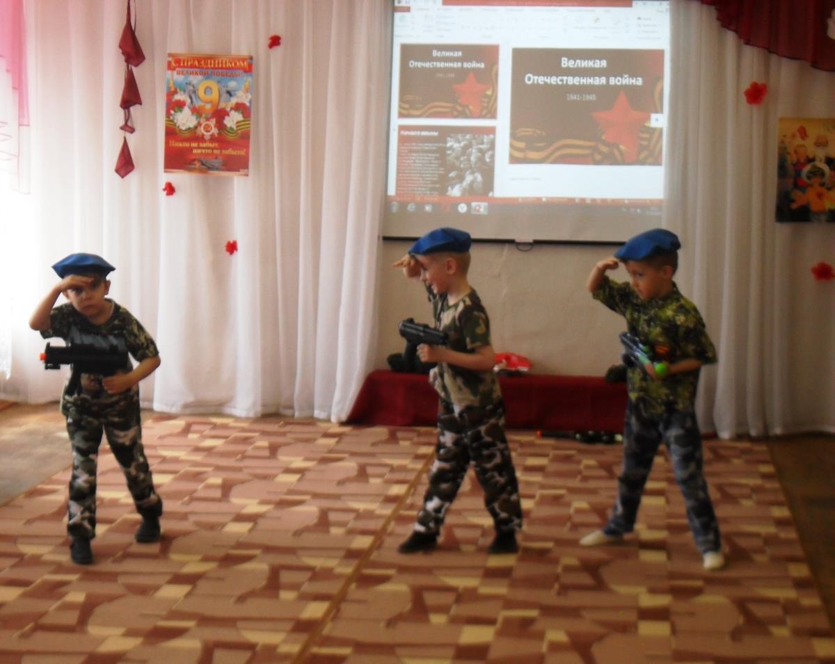 Работая в детском саду музыкальным руководителем в рамках гражданско – патриотического воспитания с детьми старшего возраста провожу много разных мероприятий, посвященных Дню Победы: «Военный парад дошколят», «Чтим и помним», «Жди меня», «Слава Великой Победе». Дети учат стихи и песни военного времени.