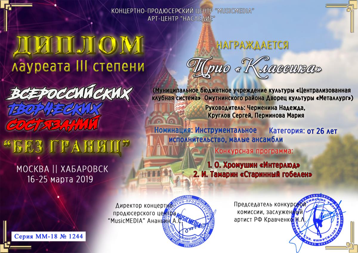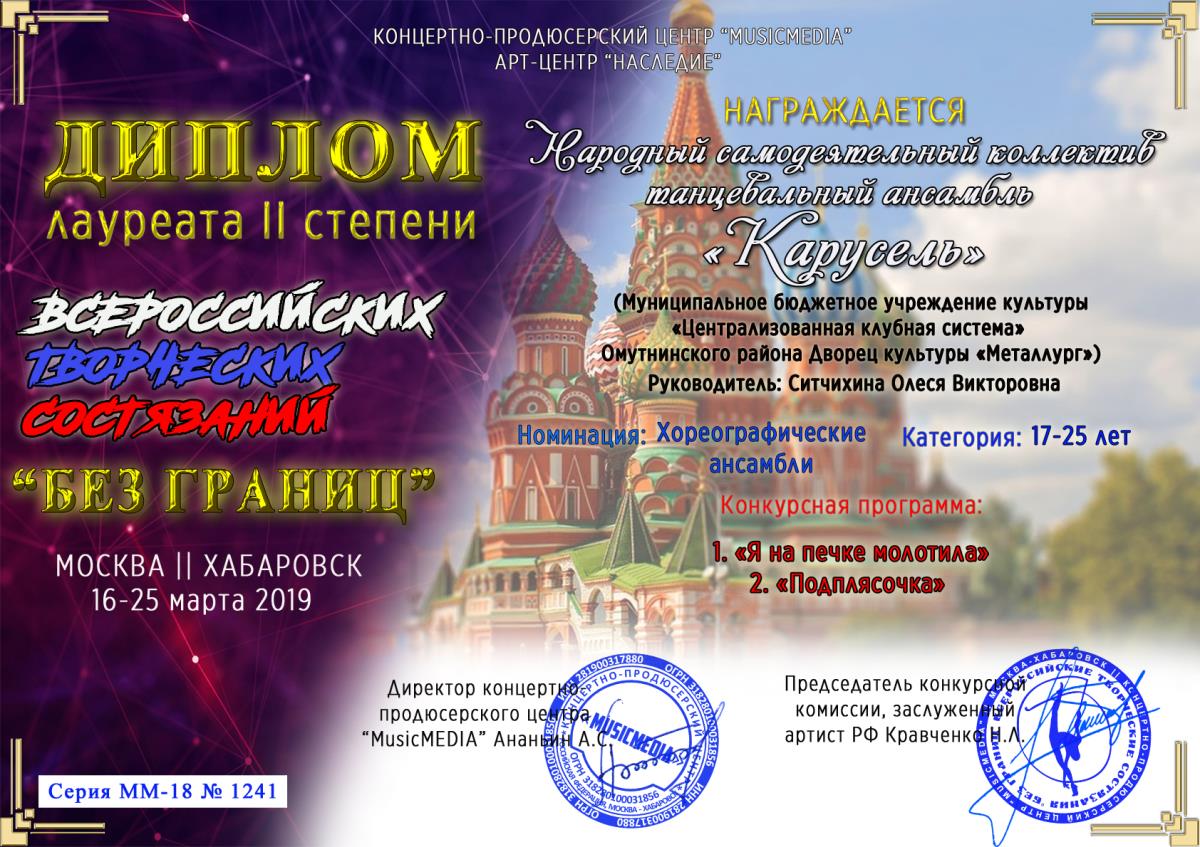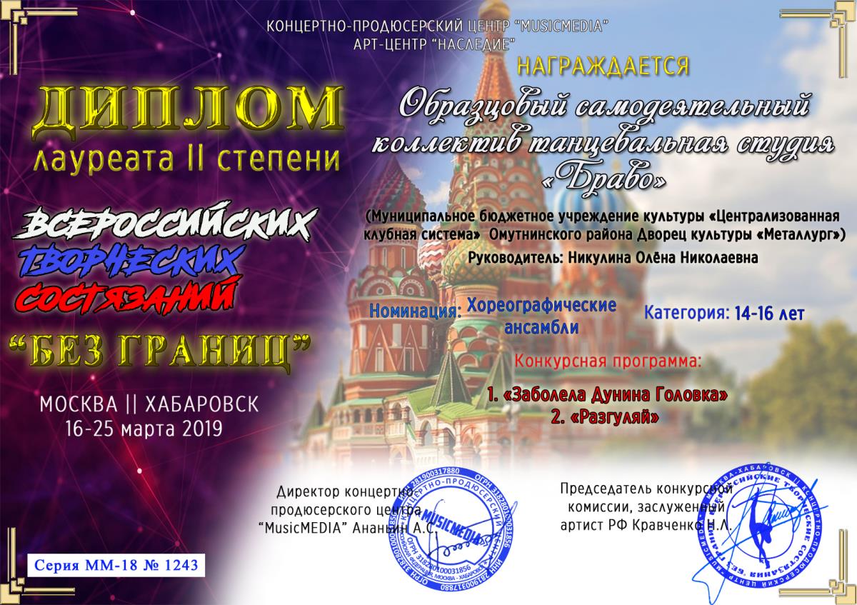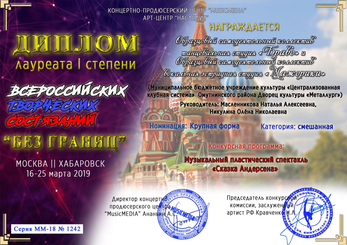 Стали известны результаты Всероссийских творческих соревнований «Без границ». По итогам конкурсного отбора диплом Лауреата I степени завоевал музыкальный пластический спектакль «Сказка Андерсена», его режиссеры-постановщики Наталья Масленникова и Олёна Никулина и юные артисты образцовой танцевальной студии «Браво» и образцовой вокальной эстрадной студии «Мажорики».