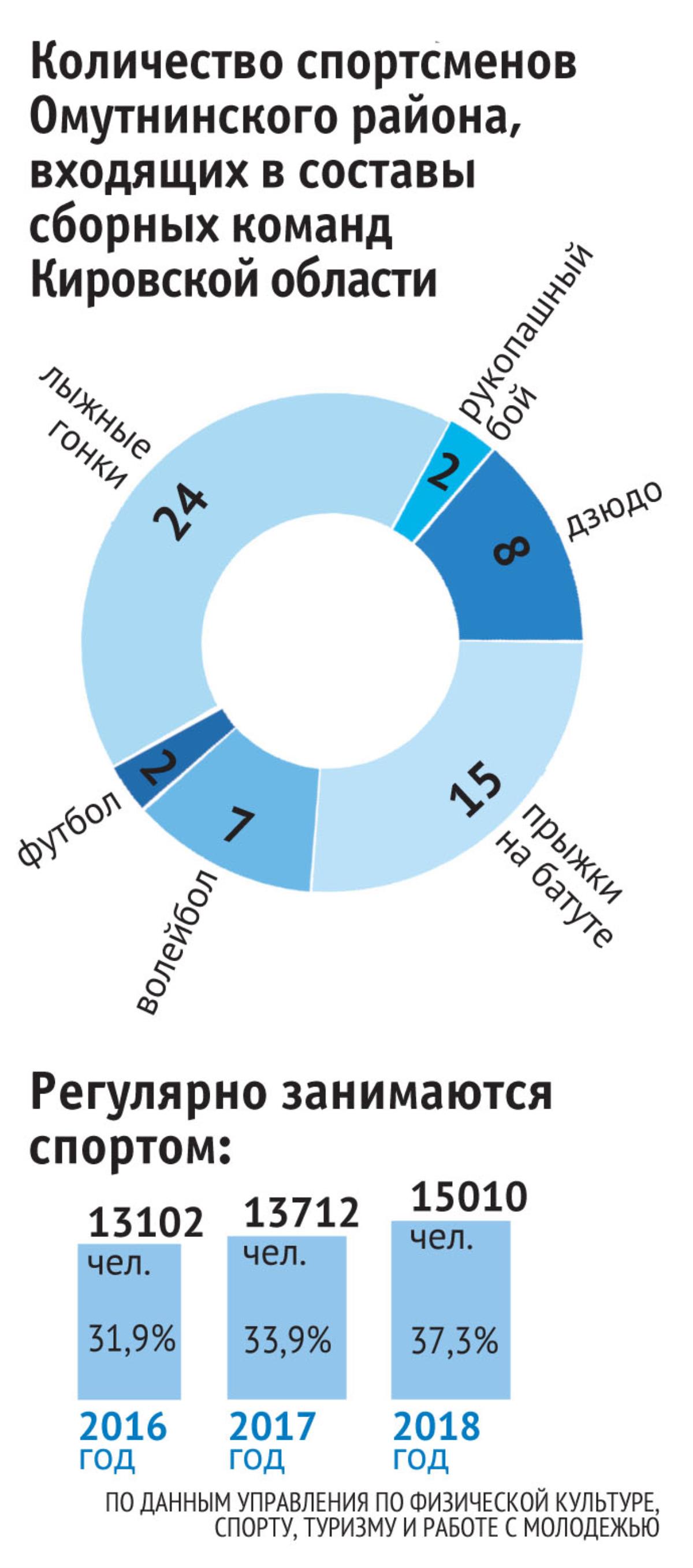 – Два стадиона, двадцать три спортивных зала, сорок шесть плоскостных сооружений, три стрелковых тира, стрельбище, лыжная база и другие – всего девяносто пять. В 2018 году введены в строй три комплекса уличных тренажеров в территориальных общественных самоуправлениях Омутнинска: «Мирном», «Бамовском» и «Лесозаводском».