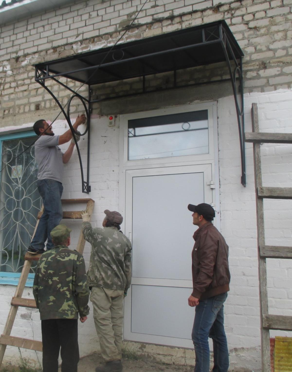 План благоустройства сотрудники учреждения воплощали в жизнь своими силами. В роли волонтера выступил омутнинский металлург Роман Каретников, который изготовил в домашней мастерской узорный козырек, железную основу для скамейки и урну. В один из выходных дней односельчане помогли установить козырек над входной дверью здания и скамейку.