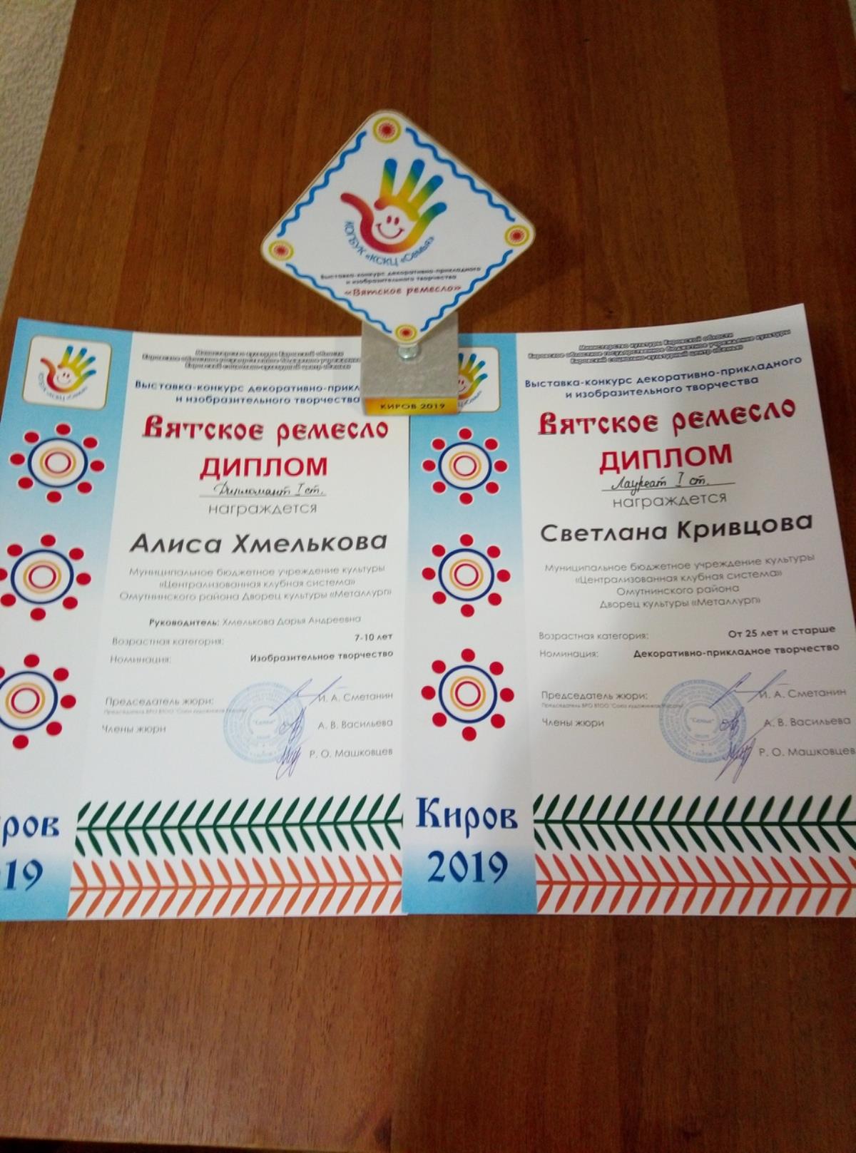 В выходные дни в Кировском социально-культурном центре «Семья» прошла выставка-конкурс декоративно-прикладного и изобразительного творчества «Вятское ремесло». По итогам конкурсного отбора Светлана Кривцова, руководитель образцового театра костюма «Силуэт», представившая на конкурс женский костюм «Разгуляй», стала Лауреатом I степени в номинации «Декоративно-прикладное творчество». Алиса Хмелькова, участница художественной самодеятельности, с рисунком «Матрешки» стала дипломантом I степени в номинации «Изобразительное творчество».