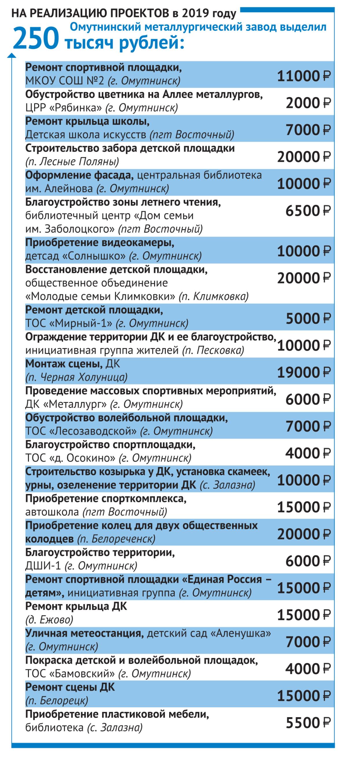 Четверть миллиона рублей в текущем году Омутнинский металлургический завод вложил в грантовый конкурс «Социальная инициатива». В нем приняли участие 34 проекта из городских и сельских поселений. Активность проявили жители Омутнинска, Восточного, Лесных Полян, Климковки, Песковки, Черной Холуницы, Залазны, Белорецка, Ежово. Финансовую поддержку получили 24 проекта, большинство из которых уже реализованы.