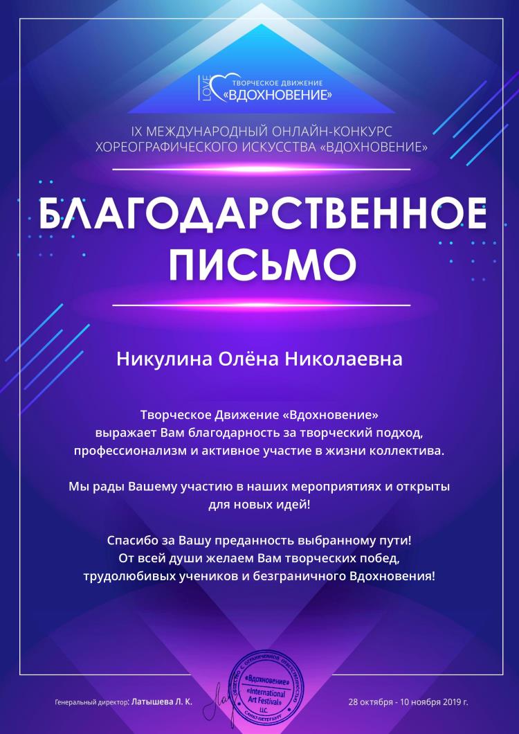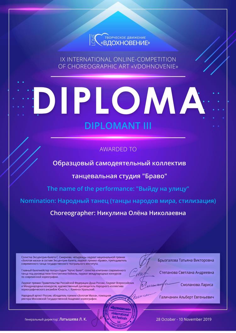 Образцовый самодеятельный коллектив танцевальная студия «Браво», которым руководит Олёна Никулина, принял участие в IX Международном заочном отборочном туре онлайн-конкурса «Вдохновение».