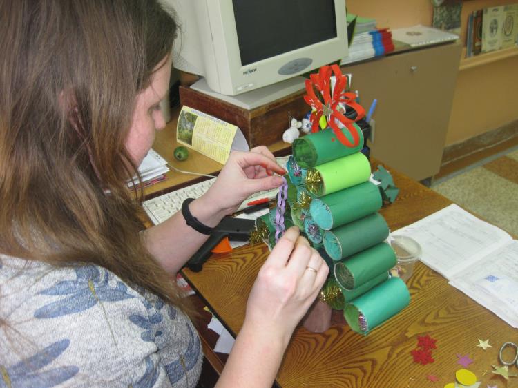 Такие занятия прививают ребятам заботу об окружающей среде и приучают относиться ко всему с вниманием. Немного фантазии, и школьники смастерили новогоднюю елочку.