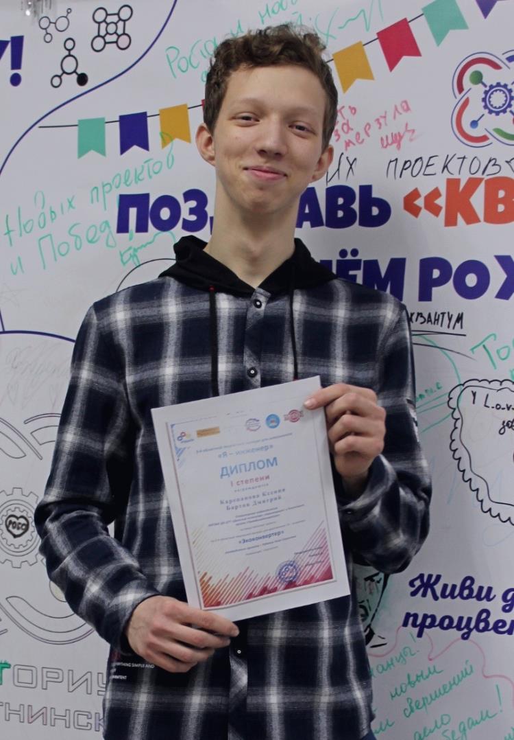 Дипломом первой степени в номинации "Экология" наградили Ксению Карепанову и Дмитрия Бартова за проект "Экоконвертер" (наставник Промдизайнквантума А.С. Рубанник). Дипломы участников вручили: Марии Карепановой, проект "Безболезненные инъекции", номинация "Медицина", наставник Наноквантума С.Н. Дружинина; Юлии Костицыной, проект "Изучение проблемы загрязнения бытовыми отходами на территории Кировской области", номинация "Экология", наставник Наноквантума С.Н. Дружинина; Виталине Захаринской, проект "Способы очистки воды в домашних условиях", номинация "Экология", наставник Наноквантума С.Н. Дружинина.