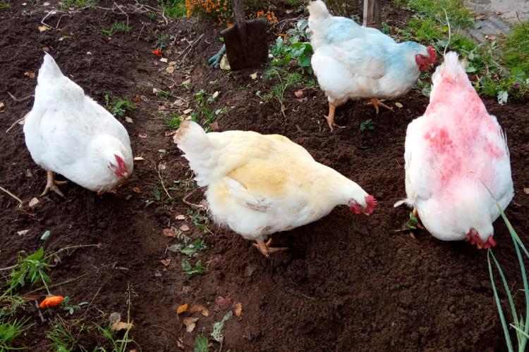 Фото с курами. Когда по осени наши бройлеры стали нести яица, я их отметила краской для удобства. Вот такие красавицы они и ходили.