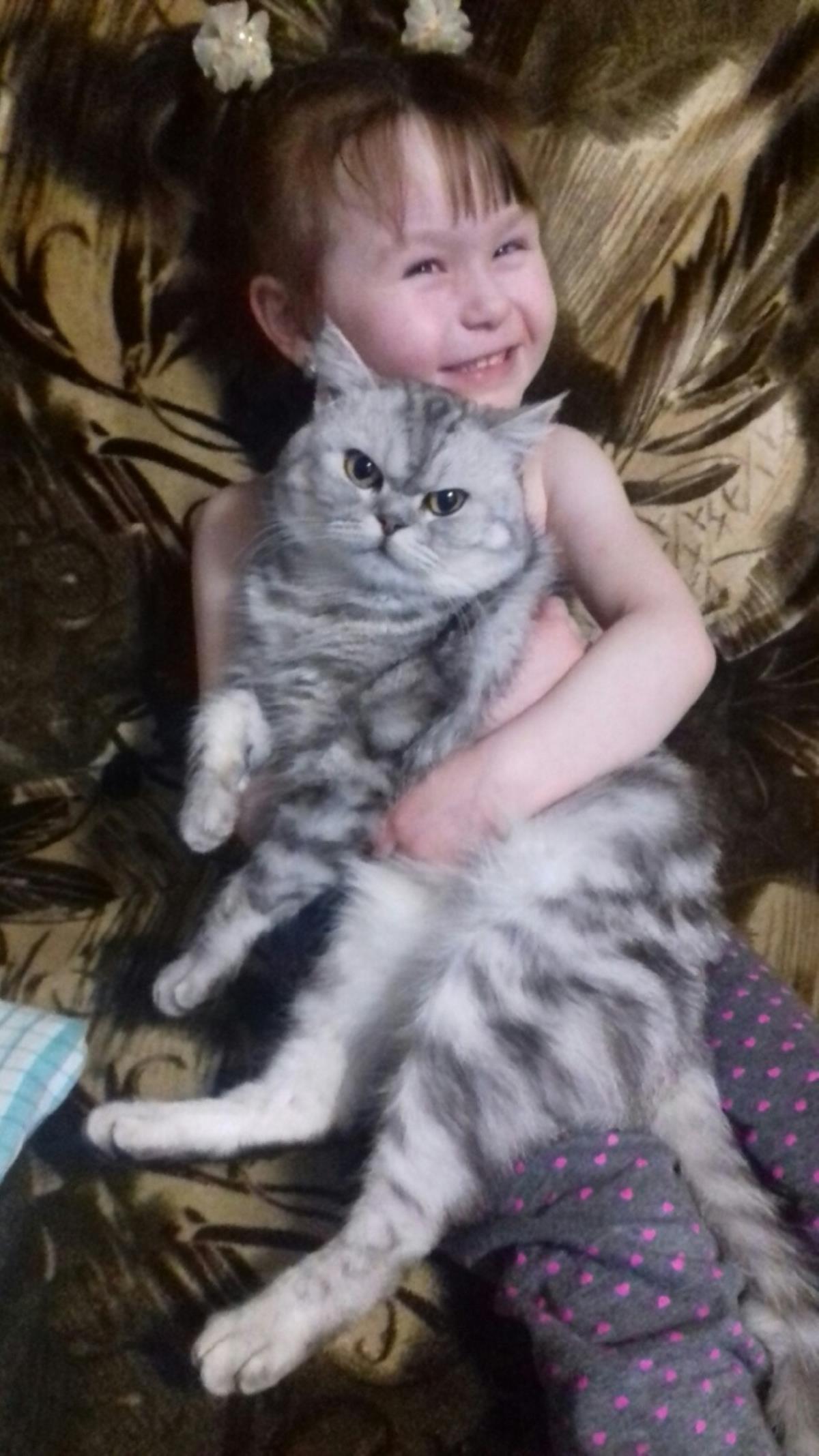 На фото Ульяна и кот Филимончик. Филя ласковый и самый лучший кот. Ночью — укладывает, утром — будит. Филя словно антистресс, любит находиться на руках. У него такая необыкновенная мягкая шубка, что не хочется выпускать его из рук. Мы очень любим своего кота.