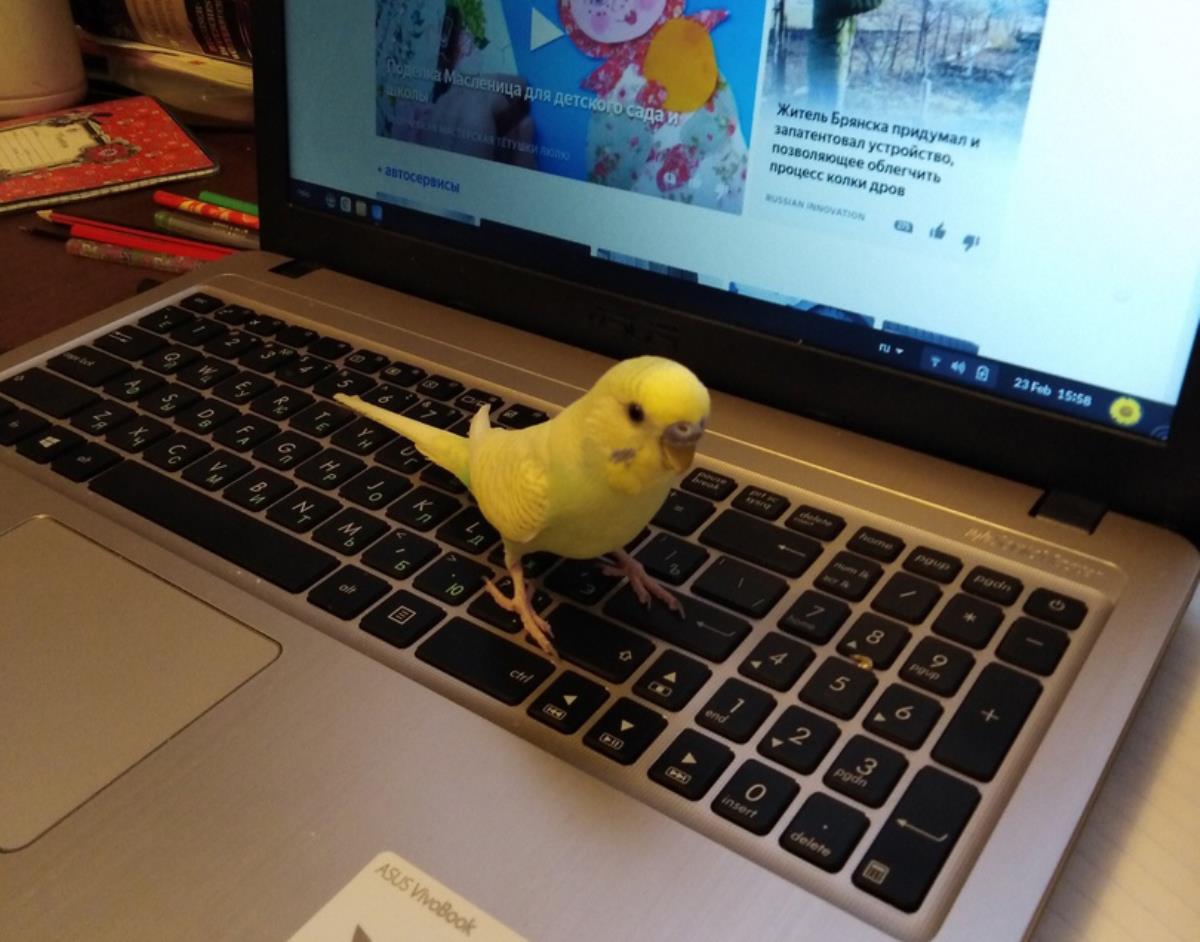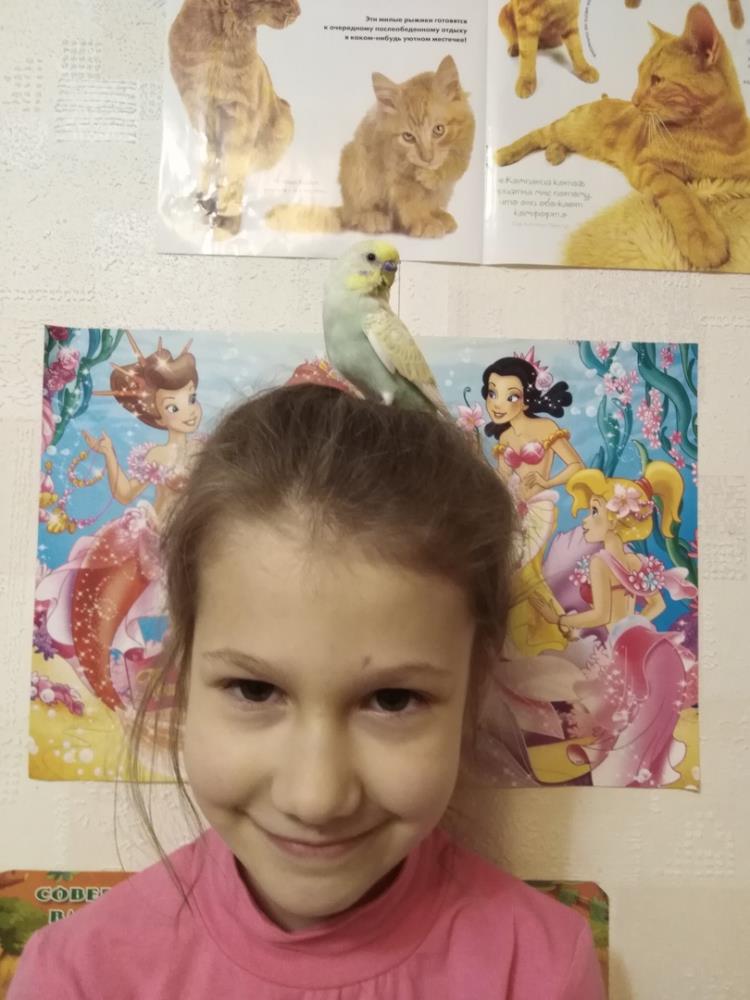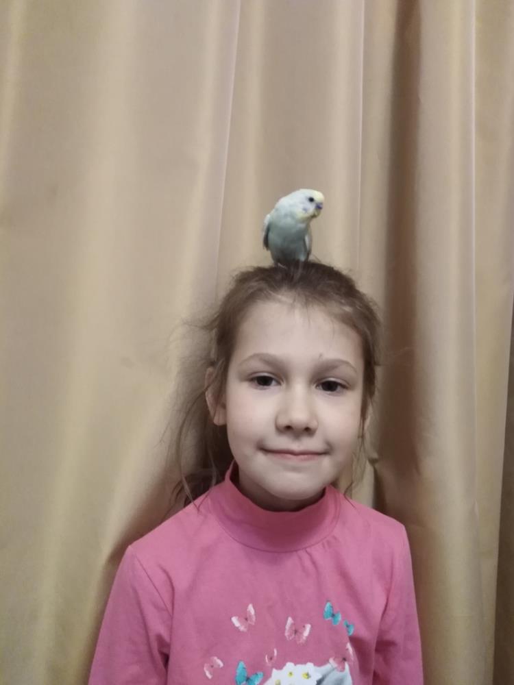 Здравствуйте! Меня зовут Лиза, мне 6 лет. А это мой питомец, мой любимый волнистый попугайчик Шуруп! Он очень общительный, любит быть в компании людей. Он ручной, ему нравится кататься на плече, сидеть у меня на голове и даже «работать» на компьютере. Я его очень люблю!