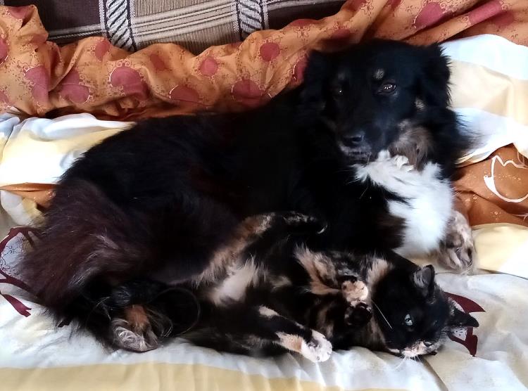 Киса — девочка была на передержке группы «Рука помощи». Интересный окрас и печальная судьба. Вначале была замкнутой, никак не могла отойти от страшных воспоминаний, от тех событий, которые случились с ней перед тем, как она попала в добрые руки. Ее вытащили буквально из пасти собак. И, конечно, прийти в дом, где живет собака, для нее было тяжело. Прошло больше месяца, и она освоилась. Да так, что сейчас спят в обнимку на кресле. Киса и Жека играют мячиками-прыгунками, гоняют их по дому. Смотрим и любуемся ими.