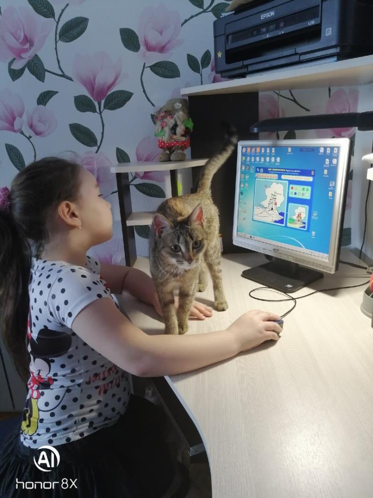 Это Ириска. Ириске скоро будет год. Она родилась в прошлом году на Пасху. Ириска очень игривый и любопытный котенок. Любит, когда ее ласкают, и сама ластится. Когда я ее глажу, она мурлычет, прямо как трактор. А еще она очень любит мешать заниматься на компьютере.