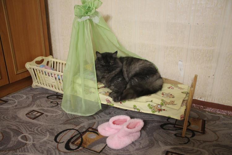 Наш кот Мишка. Он просто обожает спать в кроватке для кукол, которую мы смастерили для своей дочки.