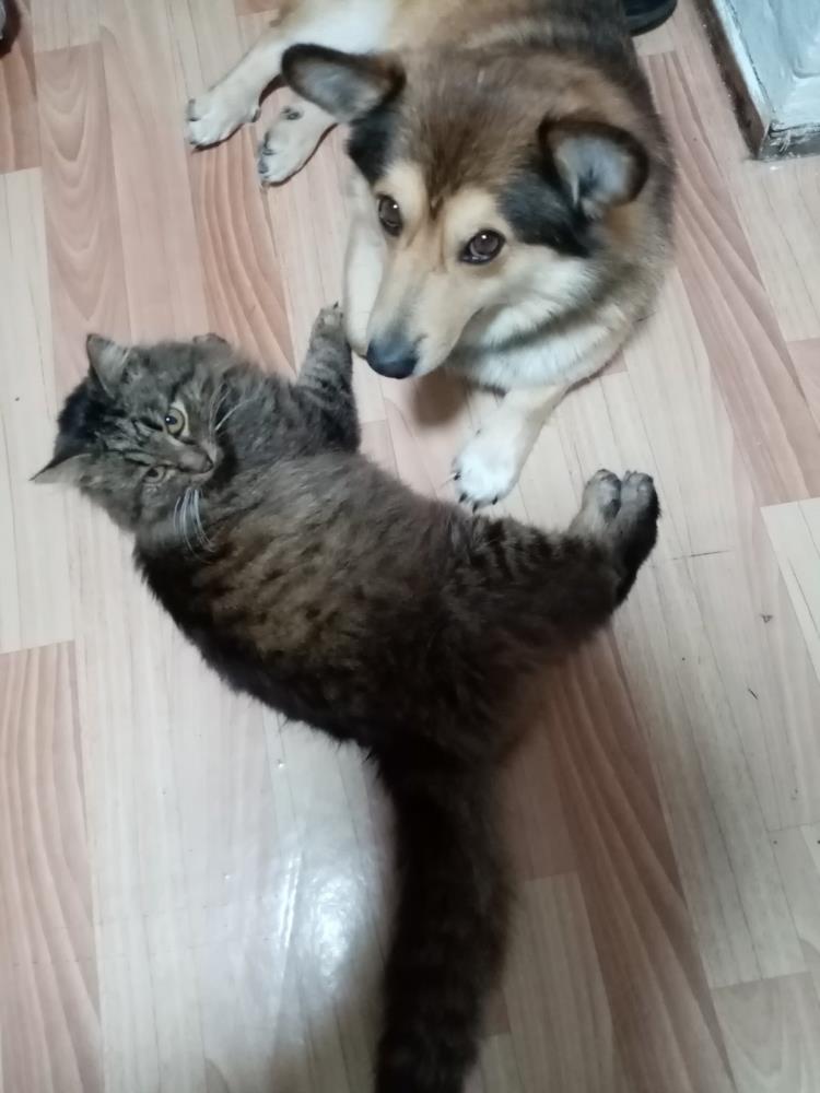 В нашей семье есть домашние питомцы: кот Бусик и собака Рекс. Они очень умные, дружат. Мы любим и ухаживаем за своими животными!