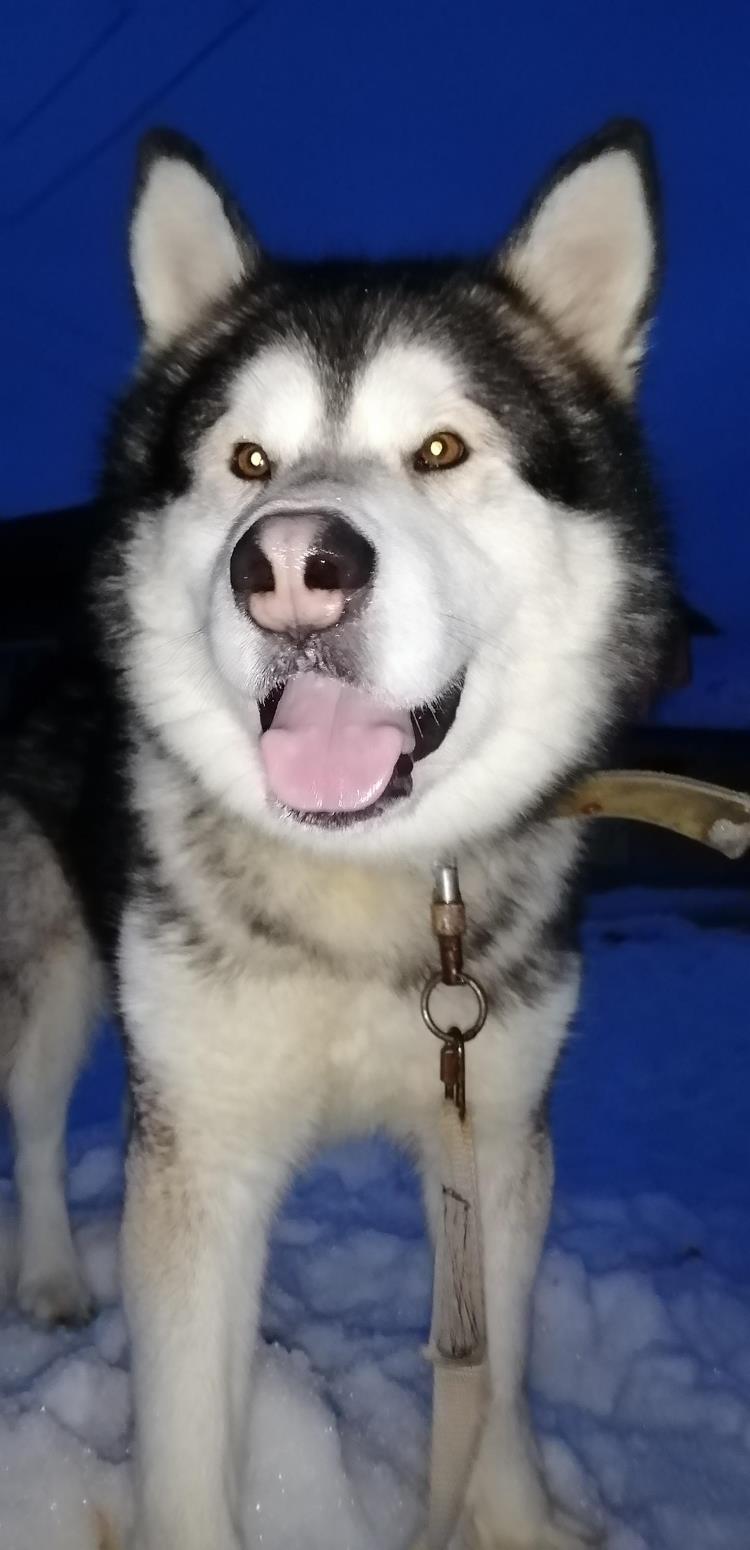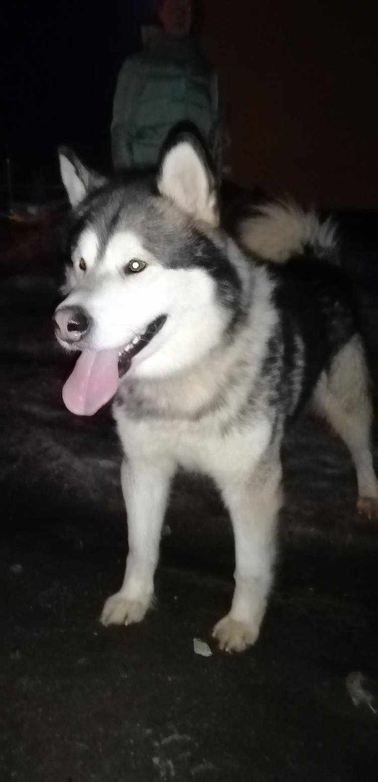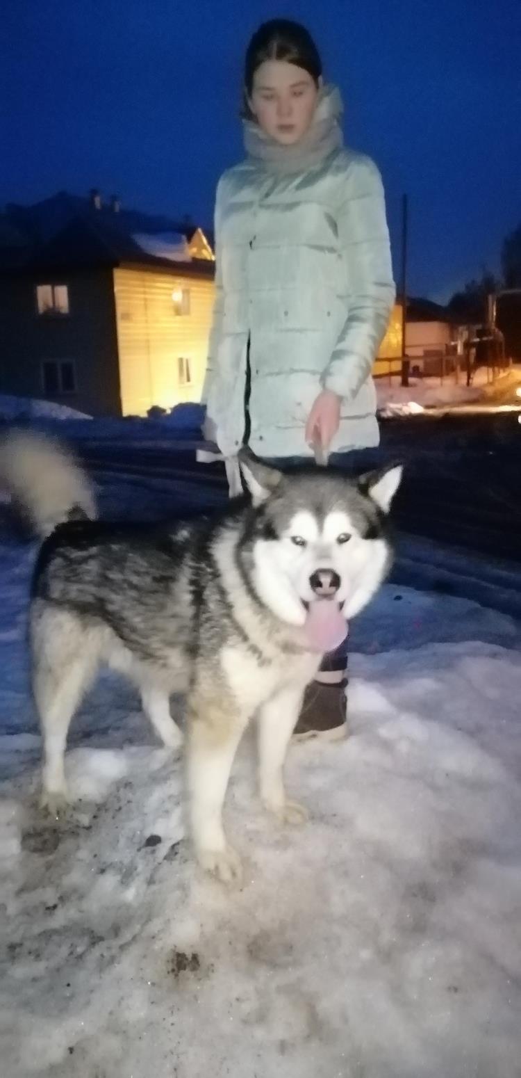 Нашего питомца зовут Харли, его порода - аляскинский маламут. Он очень активный и жизнерадостный пёс. Очень любит людей. Из-за особенности породы он не умеет лаять, а произносит различные звуки.
