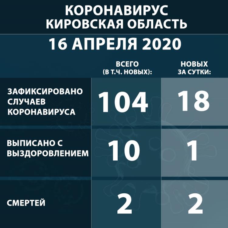 Общее число случаев заболевания коронавирусом в регионе составляет 104 человека, сообщает министерство здравоохранения Кировской области.