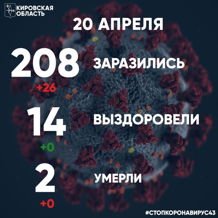 - Министерство здравоохранения региона информирует, что по состоянию на утро 20 апреля в области зарегистрировано 26 новых случаев коронавируса. Таким образом, число заражений COVID-19 в регионе увеличилось до 208 случаев, из которых 39 ожидают подтверждения в лаборатории Центра гигиены и эпидемиологии Кировской области.