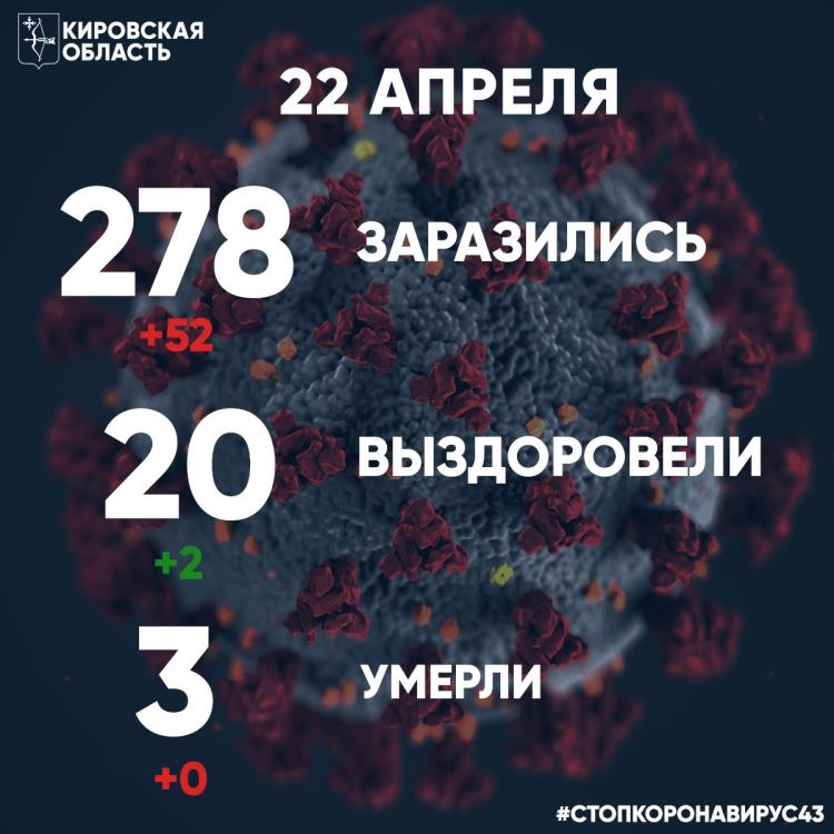 Общее число зараженных инфекцией нового типа на сегодняшний день в регионе составляет 278 человек. Всем пациентам организовано медицинское наблюдение и лечение в полном объеме в условиях инфекционных госпиталей Кирова. Состояние пациентов разной степени тяжести, преимущественно удовлетворительное.