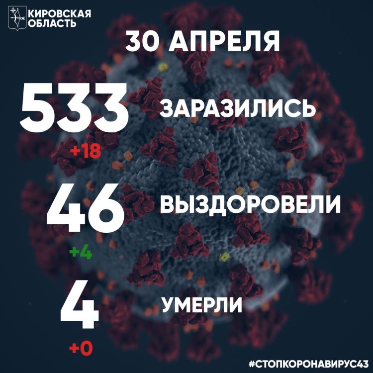 По состоянию на утро 30 апреля в Кировской области выявлено 18 новых случаев коронавируса. Общее число заражений инфекцией нового типа составляет 533 случая.