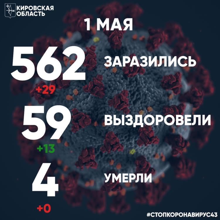 По состоянию на утро 1 мая в Кировской области зарегистрировано 29 новых случаев коронавируса. Таким образом, общее число заражений инфекцией нового типа составляет 562 случая.