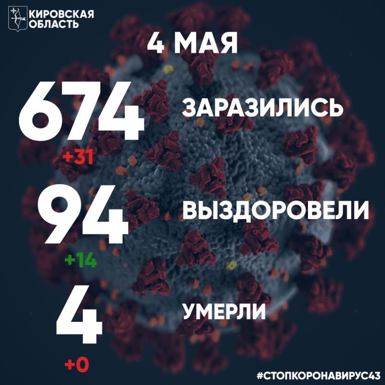 По состоянию на утро 4 мая в Кировской области выявили 31 новый случай заражения коронавирусом. Общее число выявленных случаев составляет 674.