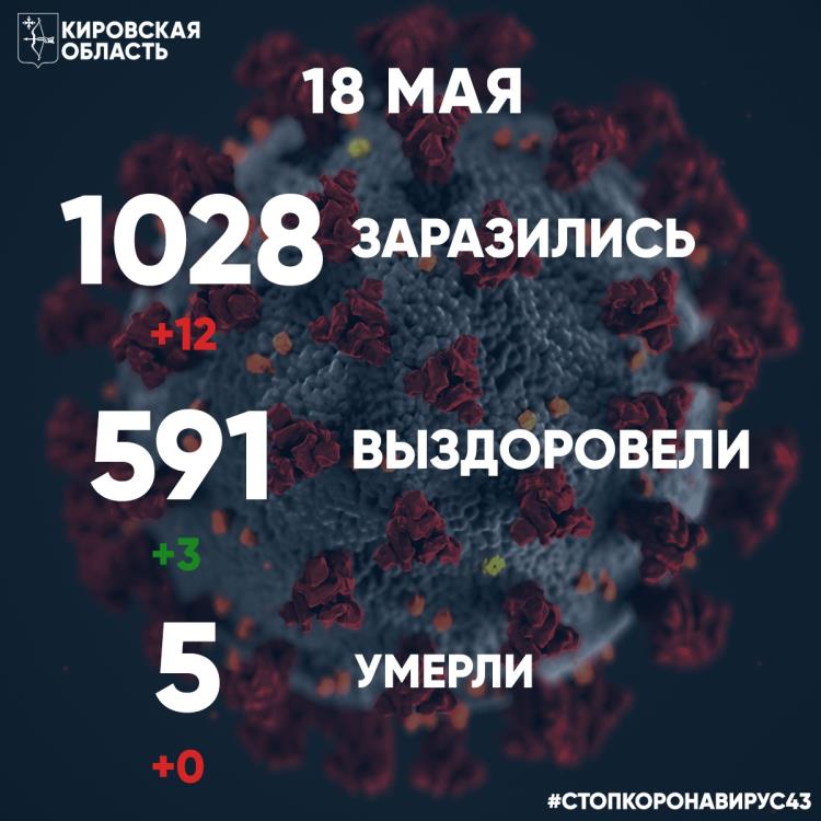 По состоянию на утро 18 мая в Кировской области выявлено 12 новых случаев заражения коронавирусом. Общее количество зарегистрированных случаев – 1028.