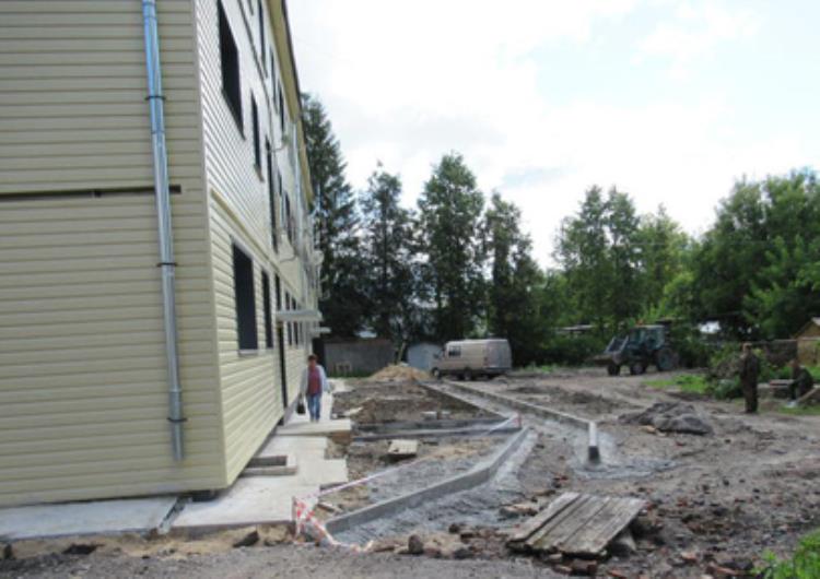 Завершена планировка дворовой территории, установлен бордюрный камень, завезены строительные материалы.