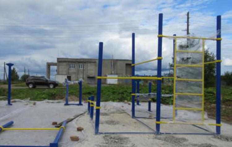 Выполнены планировка территории, заливка площадки, частично установлены спортивные тренажеры.