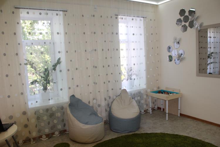 Помещение условно разделено на три зоны. В нем организовано безопасное и комфортное пространство при работе с детьми: мягкие модули (кресла-мешки, ковер, сухой бассейн), в наличии записи классической и инструментальной музыки, ступенчатая система освещения, фибероптический душ. Все это помогает ребенку успокоиться и снять эмоциональное напряжение. Основная задача педагога — снизить уровень страха, недоверия.