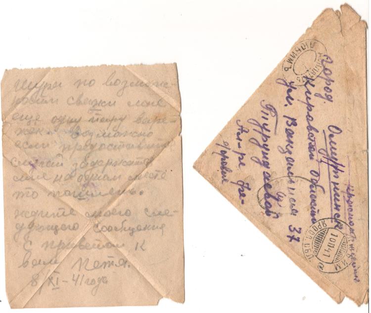 Красноармеец Турундаев Петр Михайлович в письме от 16 декабря 1941 года пишет (орфография сохранена): «Добрый день. Здравствуйте мои дорогие Шурочка, Юрочка и Валеричек. Шлю я вам свой привет и желаю всего хорошего. Как вы уважаемые мои живете. И как питаетесь. Тепло ли держите в комнате. Есть ли на рынке мука и в какую цену. Шура, если можно что купить на рынке покупай и корми детей. Хотя они сейчас живут без папы, то пусть кушают досыта. Шура посылать мне ничего не надо. Рукавицы мне дали, носки увез из дома их хватит. Так что прошу извинить что на меня вы шерсть израсходовали, а сами наверно мерзнете. За меня не беспокойтесь. До свидания милые мои, будьте здоровы».
