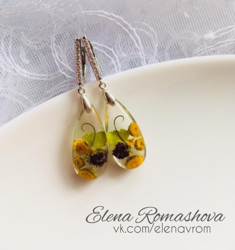 Глядя на украшения, кажется, что Елена Ромашова делает их для фей или принцесс. Тонкие и нежные, эти необычные серьги, кулоны, колечки выглядят, как застывшие капли воды с цветами внутри. И каждый раз мастерица старается придумать что-то свое – оригинальное, красивое, уникальное и говорит, что любое украшение ручной работы – вещь эксклюзивная. Как ни старайся сделать копию, а хоть чем-то она будет отличаться от оригинала.