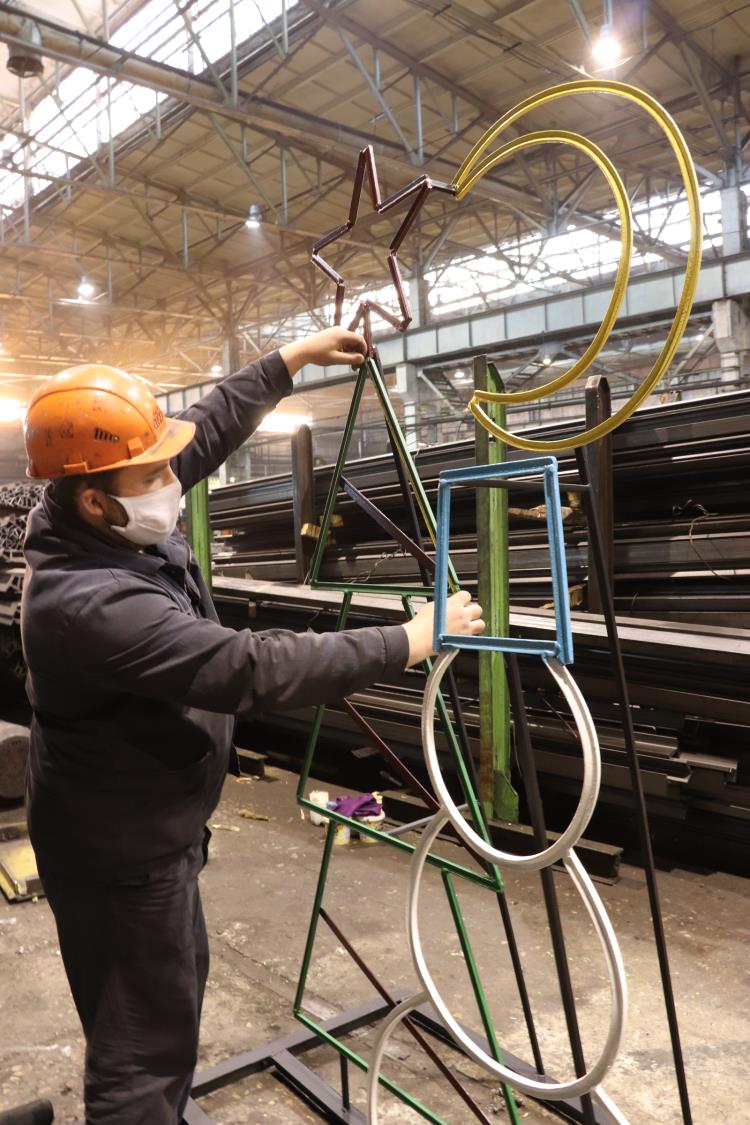 Коллектив цеха лифтовых направляющих трудится над созданием композиции «Новогодняя ночь». Руководитель проекта Евгений Смагин изготовил из сегмента, произведенного на стане «180», основу елочки, звезды, месяца и снеговика. Электросварщик ручной сварки Алексей Семакин сварил детали в единую конструкцию.