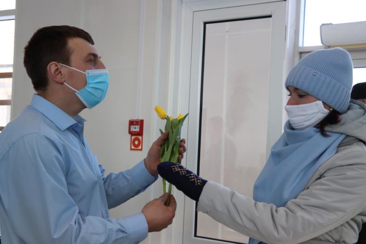 По традиции накануне Международного женского дня на проходной Омутнинского металлургического завода женщин встречают коллеги-мужчины.