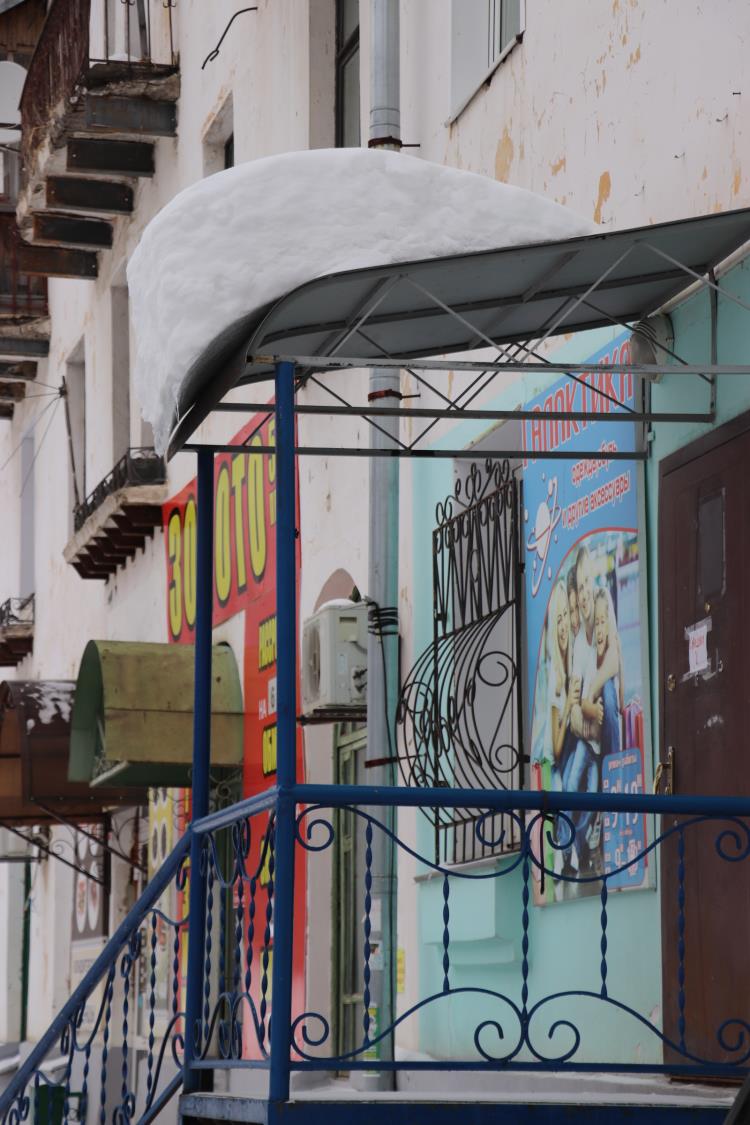 За полчаса насчитала около десятка зданий, ходить рядом с которыми опасно для жизни. Сосульки и снежные шапки на крышах нависают прямо над тротуарами. Рискованно подходить, например, к строению по улице Стальской или торговой точке по Карла Либкнехта. Снежная махина и ледяная лавина могут в любой момент обрушиться на жителей.