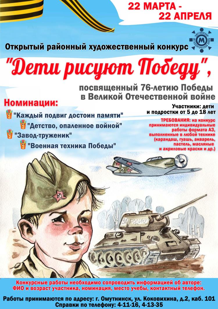 На конкурс принимаются только индивидуальные работы формата А3, выполненные в любой технике (карандаш, гуашь, акварель, пастель и др.) Каждый участник может отправить только один рисунок с 22 марта по 22 апреля по адресу: Омутнинск, ул. Коковихина, 2, каб. 101.