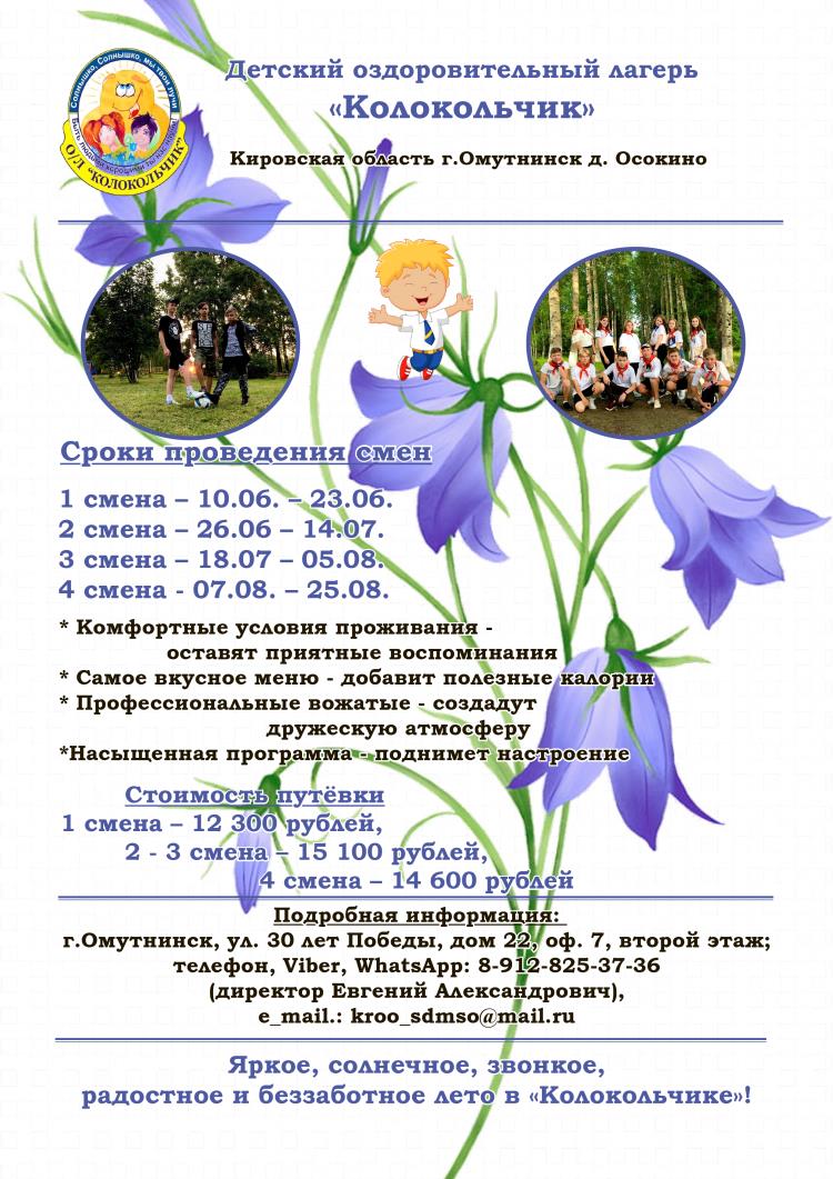 В письме необходимо указать: ДОЛ «Колокольчик», номер смены, номер телефона, адрес электронной почты, ФИО родителя или законного представителя. Дождаться подтверждения и дальнейших инструкций. Справки по телефону: 8-912-825-37-36.