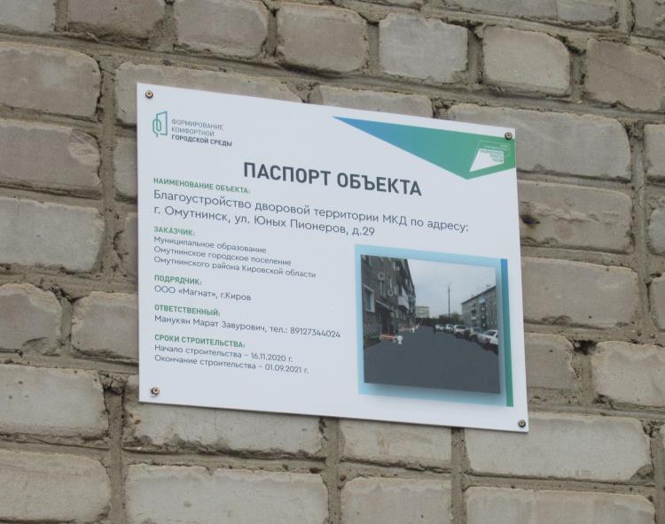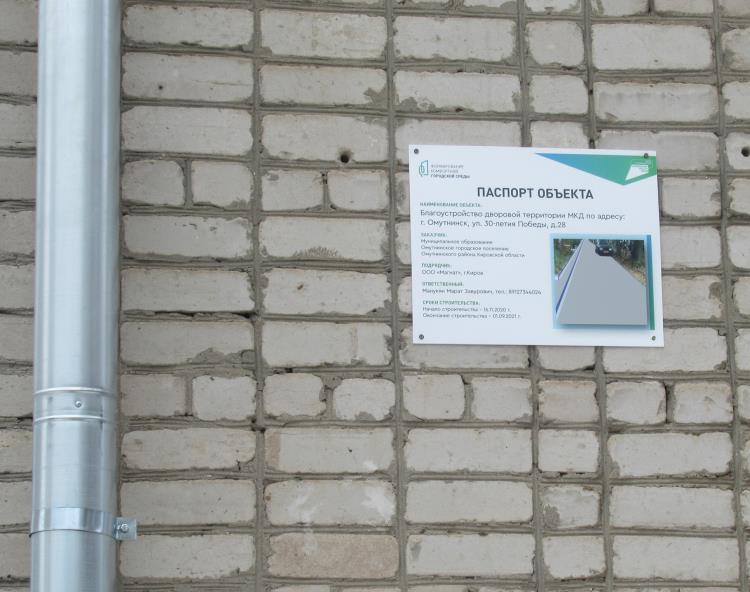 ООО «Жилищные услуги» (директор В.С. Солтыс) установило информационные таблички – паспорт объекта - на трех многоквартирных домах по адресам: г. Омутнинск, ул. Юных пионеров,27, 29, ул. 30-летия Победы,28, дворовые территории которых будут благоустроены в 2021 году в рамках реализации проекта «Формирование комфортной городской среды».