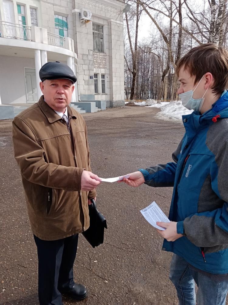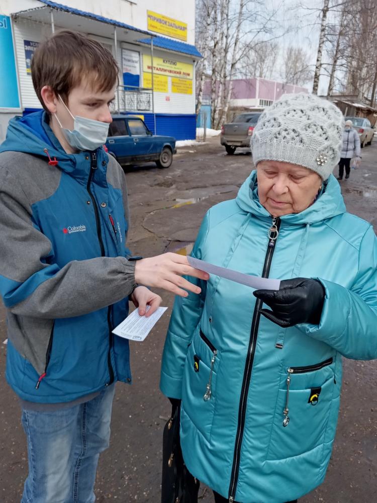 Волонтёры раздавали листовки с призывом зарегистрироваться на портале «Госуслуги», подтвердив свою учетную запись для принятия участия в рейтинговом голосовании с 26 апреля по 30 мая 2021 года на федеральной платформе www.43.gorodsreda.ru по выбору общественной территории, подлежащей благоустройству в 2022-м.