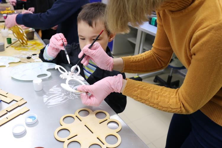 Все элементы сначала были вырезаны из фанеры на лазерном гравере. Затем ребята собирали и раскрашивали изделие акриловыми красками.